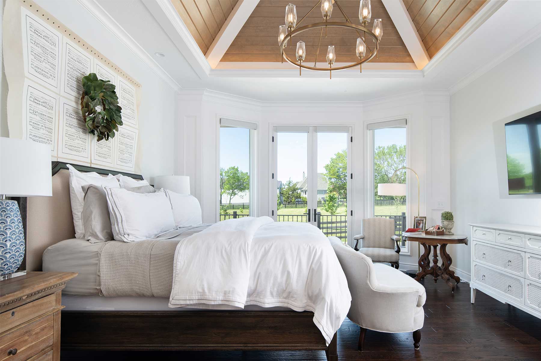 More privately, the project team opened up the primary bedroom, adding French doors that lead to a newly designed deck. The vaulted ceiling adds a sense of grandeur to the room, enhancing its openness and inviting natural light to flood in.