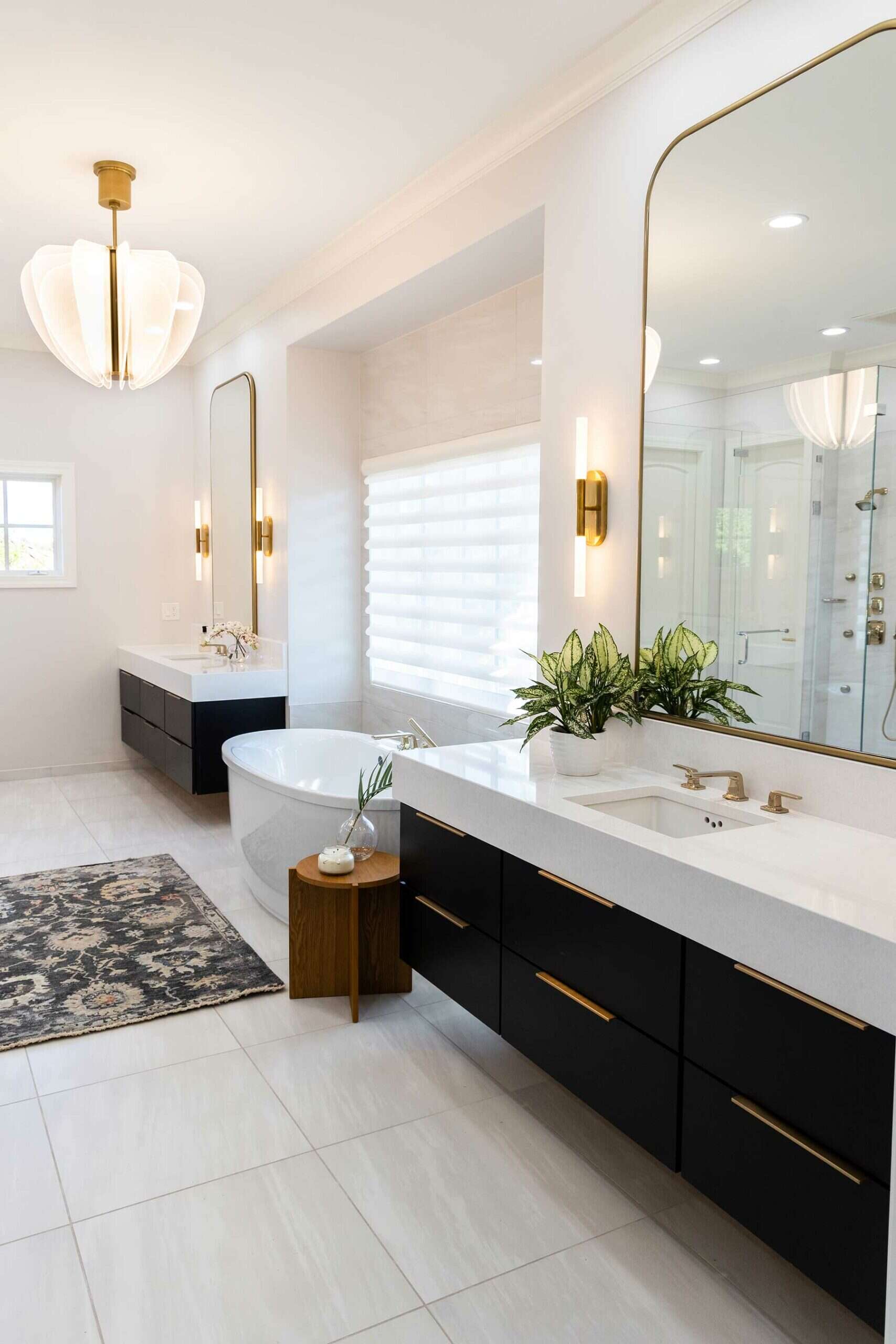 Previously, the bathroom was a dated space with pillars and unfashionable cabinets. The room now showcases a black-and-white color scheme, highlighted by handsome dual vanities, his-and-hers toilets and a large zero-entry shower with a quartz bench.