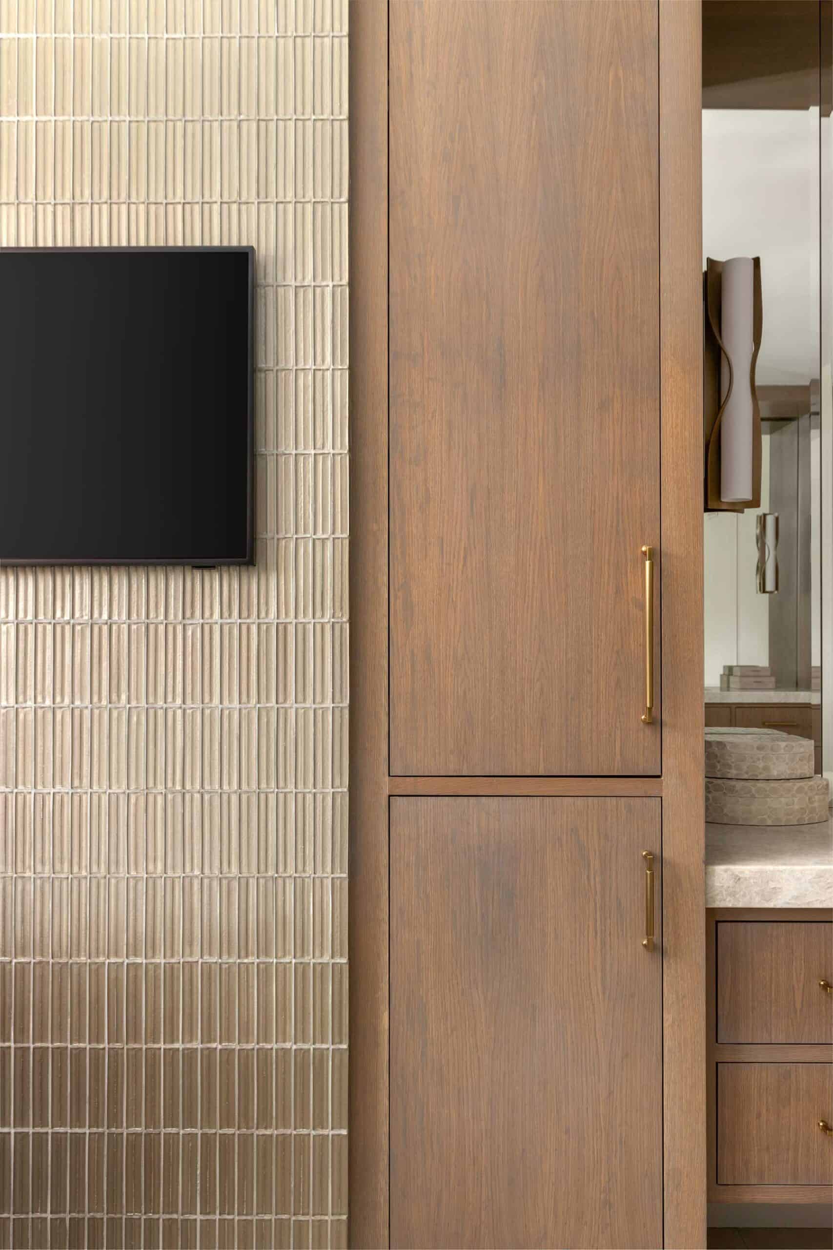 Coulas, referred by contractor Evan-Talan Homes, drafted plans for the primary bathroom’s complete overhaul, including a special request for a mounted television visible from the bath and shower. She designed an updated flow that kept the home’s structure intact.