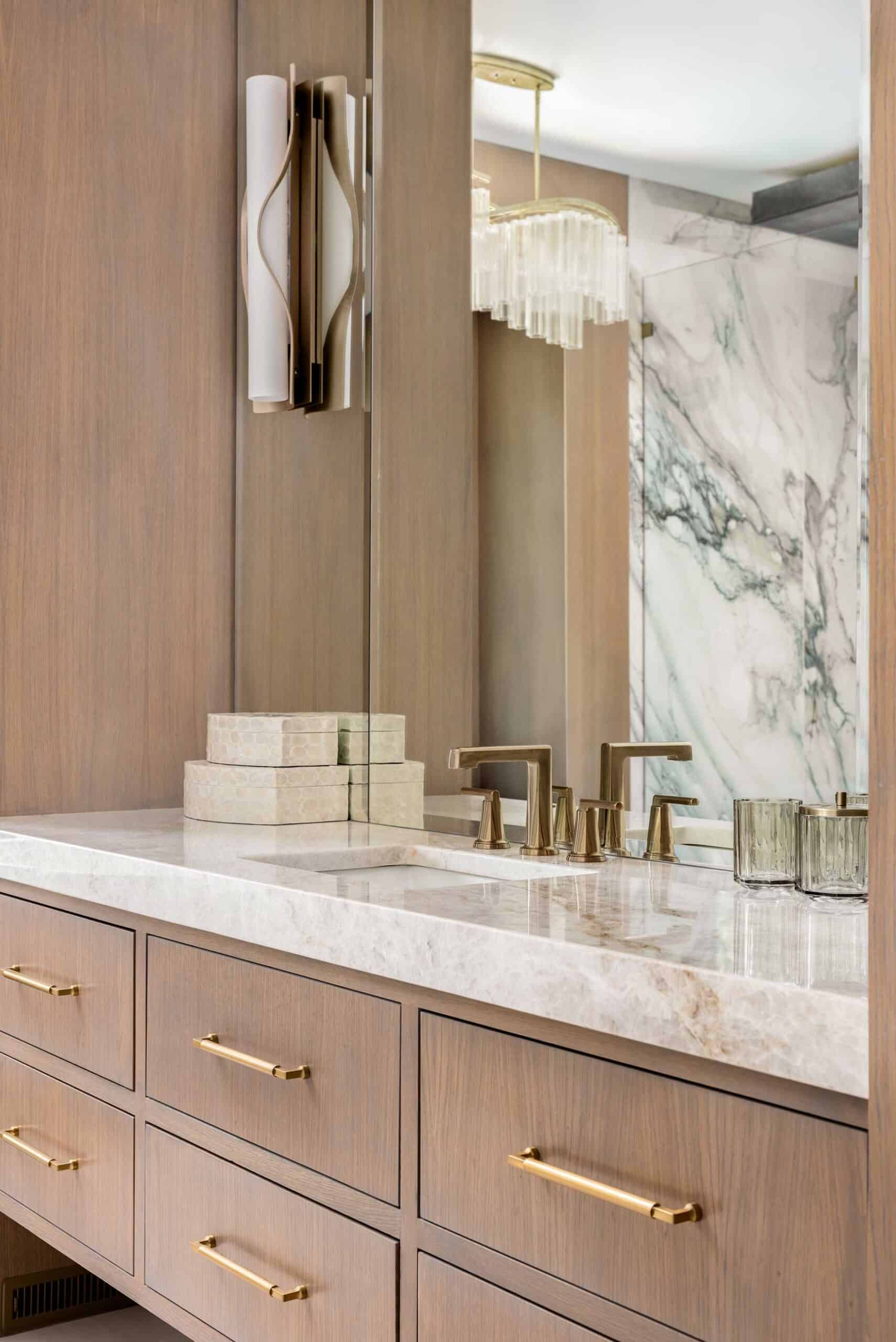 A flowing chandelier highlights the soaking tub as a focal point of the room and a quiet invitation to relax. Mirrored his-and-her vanities in rift-sawn white oak are flanked by tall storage cabinets; their depth is exaggerated by brilliant lighting from every angle. All the components of the renovation work in tandem to bring the previously dark space into the light.