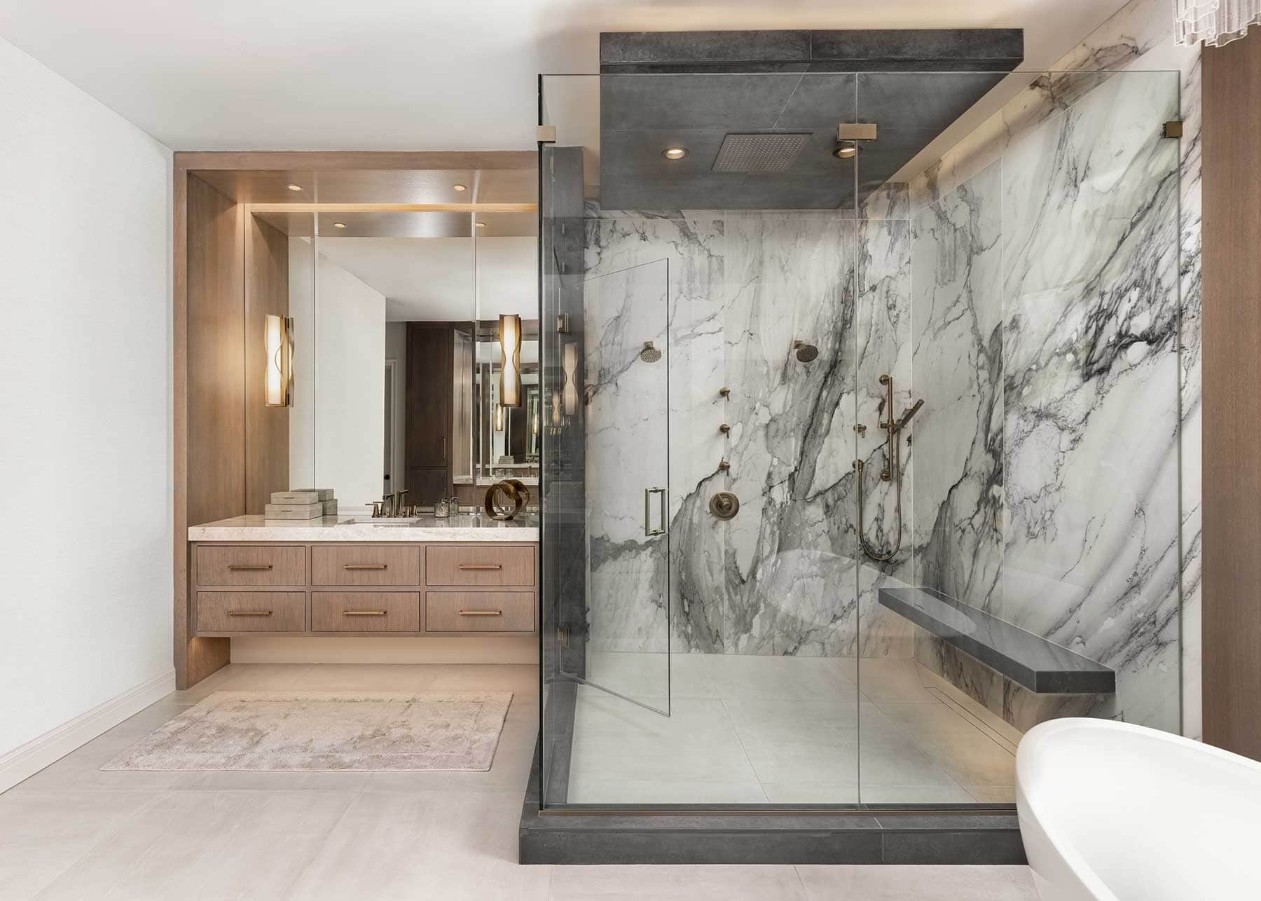 A designer’s creative custom work solves multiple issues in a primary bathroom remodel.