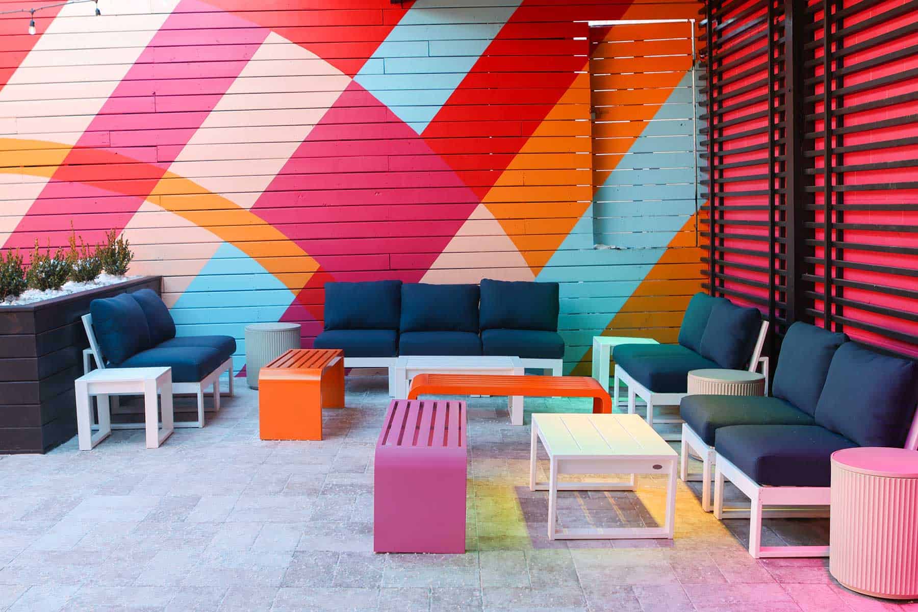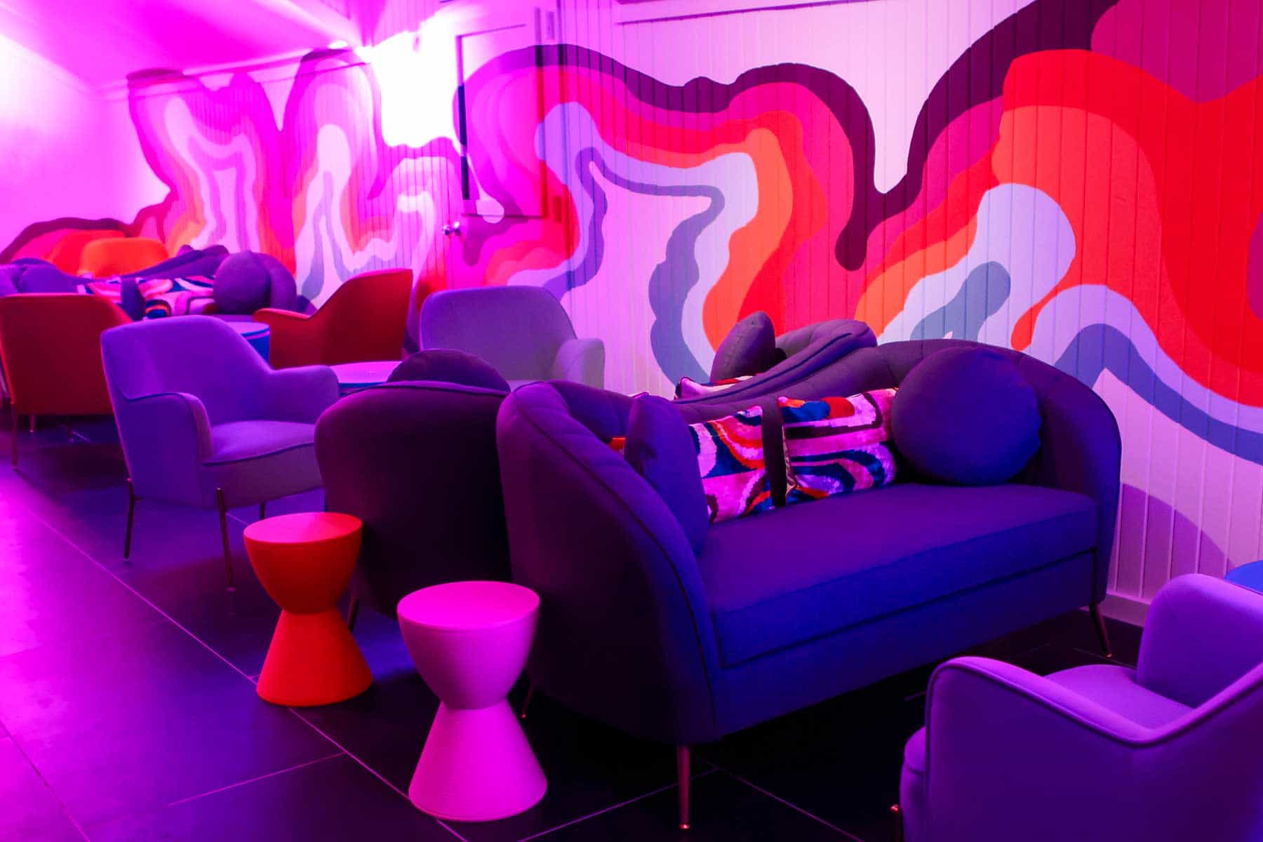 An undulating, wall-spanning, colorful mural, cozy loveseats, and bucket-style chairs fill the adjacent cove area, where adjustable lighting shifts the mood. Upstairs, the brighter Q&A lounge resembles a speakeasy, with a quieter vibe and deep teal wall curtains. There are mixologists and a dressing area for performers, too. On the patio, murals with an urban feel complement comfortable, easy-to-move furnishings, plenty of overhead lighting, and ceiling-mounted space heaters.