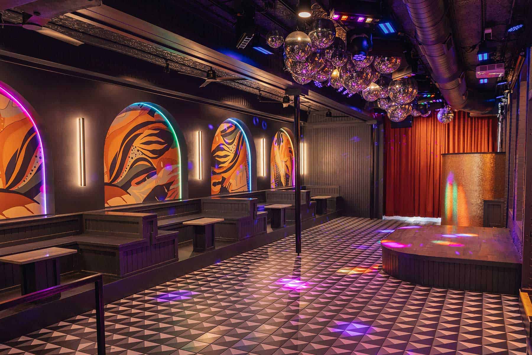 The sleek black, first-floor bar incorporates dramatic, mural-filled wall arches, disco balls, and a dance floor, plus adjustable mood lighting. Two televisions visually melt into the surrounding black walls when turned off.