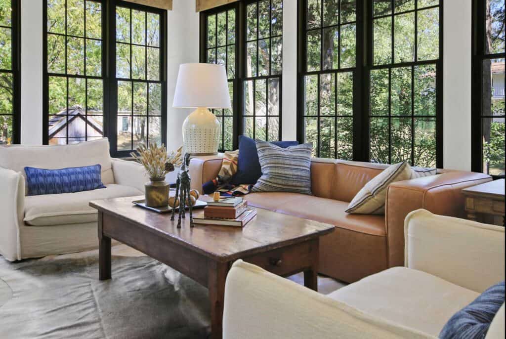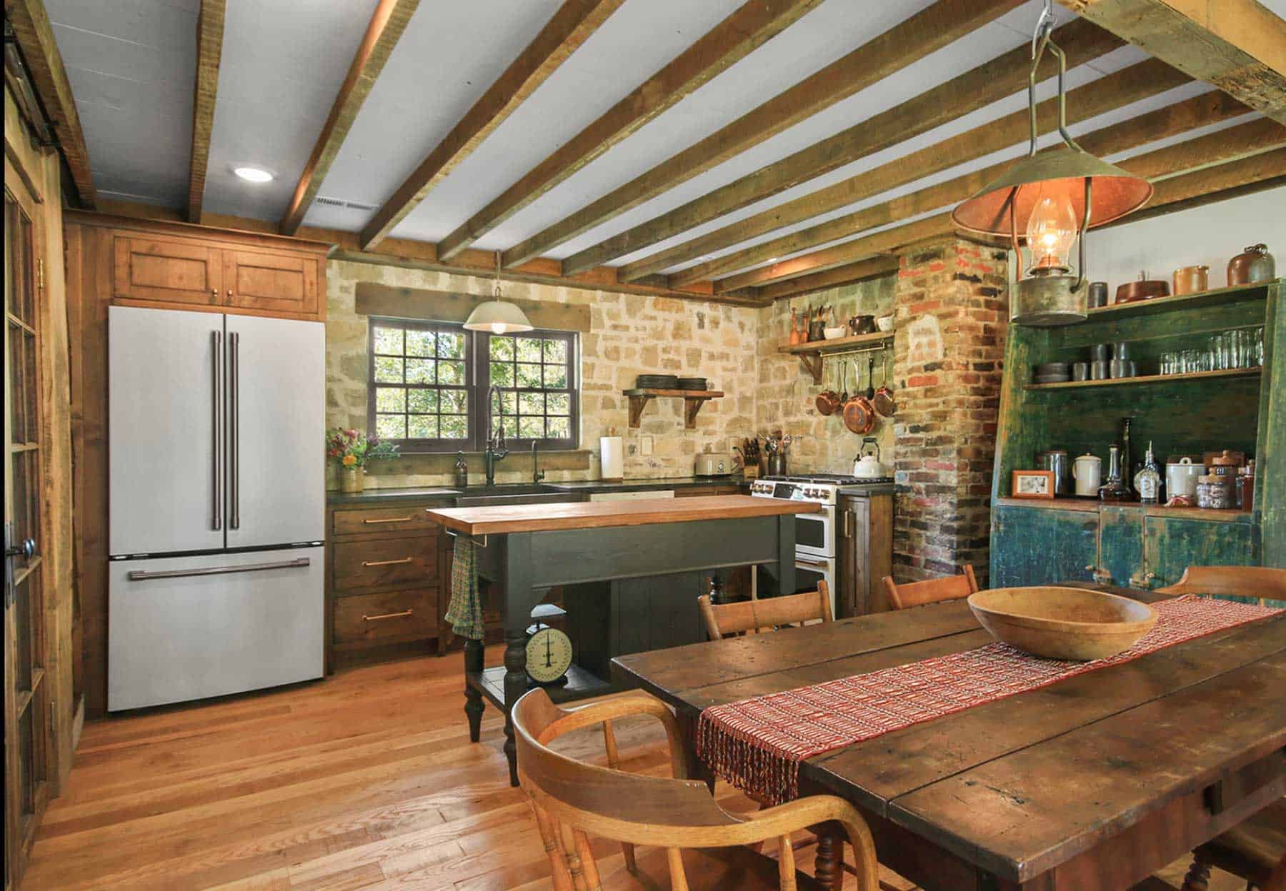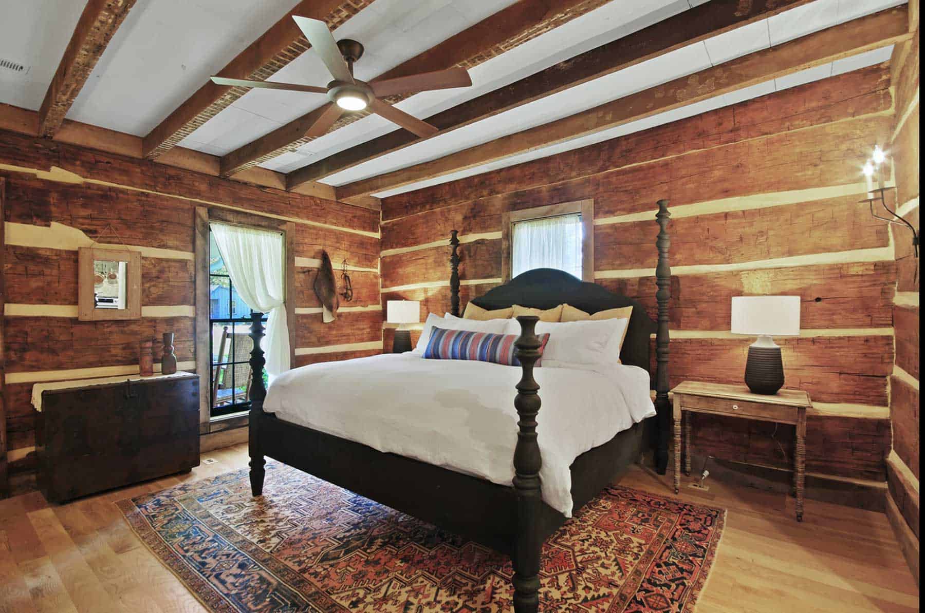 After a year of renovation, the 1,300-square-foot home, now detailed down to the chinked logs, reclaimed beams and cedar flooring, is delightful for those looking to make an overnight trip out of their time in Arrow Rock.