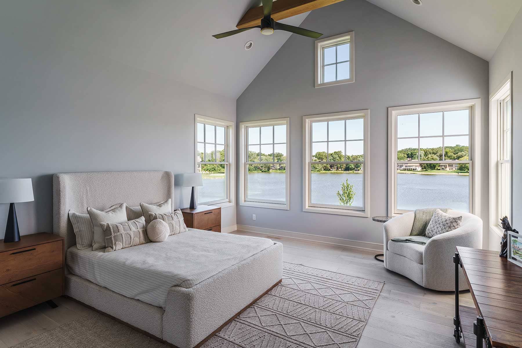 The living room continues the sweep of a monochromatic color scheme allowing the lake to become the focal point of the room. The two white oak bookcases flanking the fireplace highlight the use of arches used in other parts of the home.