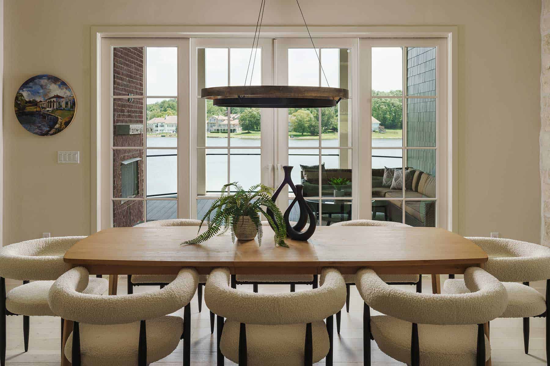 “My goal was to give the home a fresh, modern look by using Scandinavian style,” she says. “I used white oak on cabinetry and trim throughout. Coupled with the monochromatic furnishings and extensive windows that flood the home with ample natural light, the overall result is a bright, contemporary interior with a casual impression.”