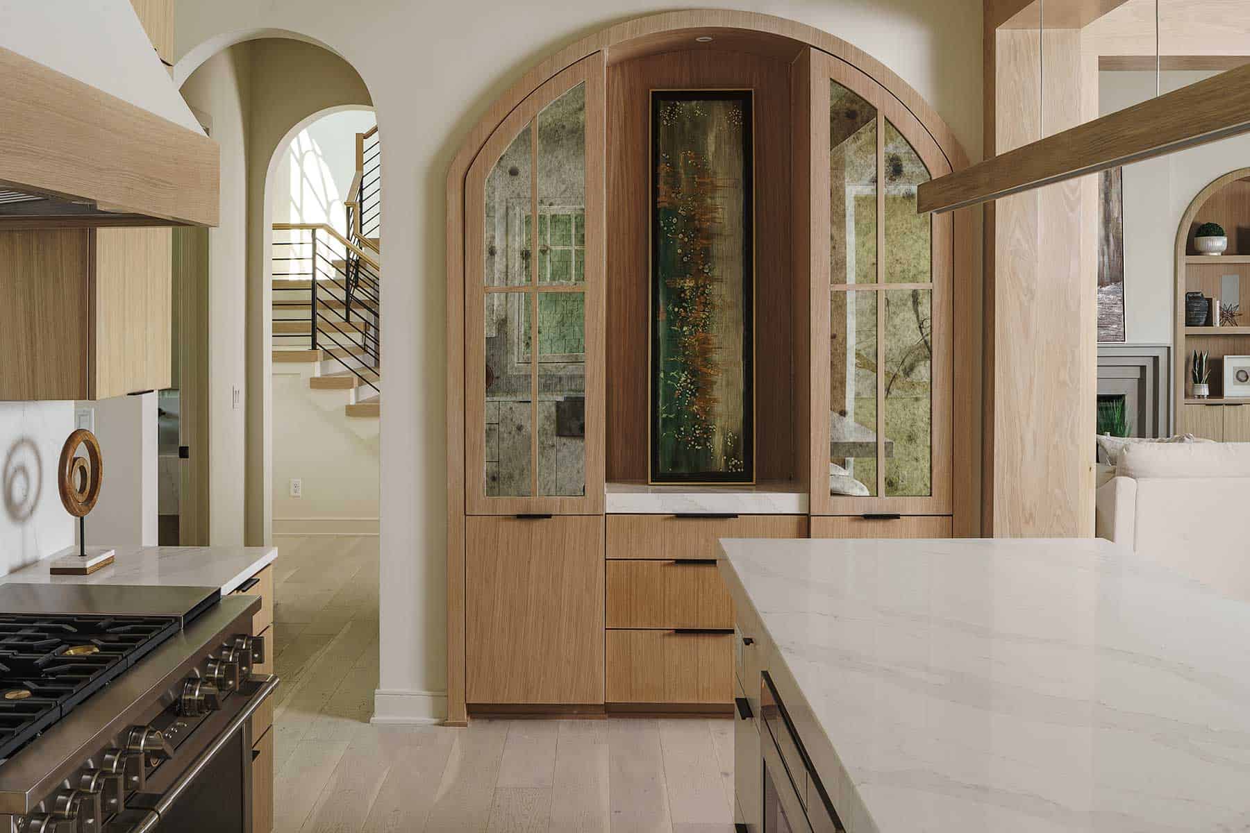 The kitchen contributes to the custom look with white oak embellishments, a quartz island, designer range and tailored lighting. Even cabinetry is designed with artistic touches of custom art and distressed glass doors.