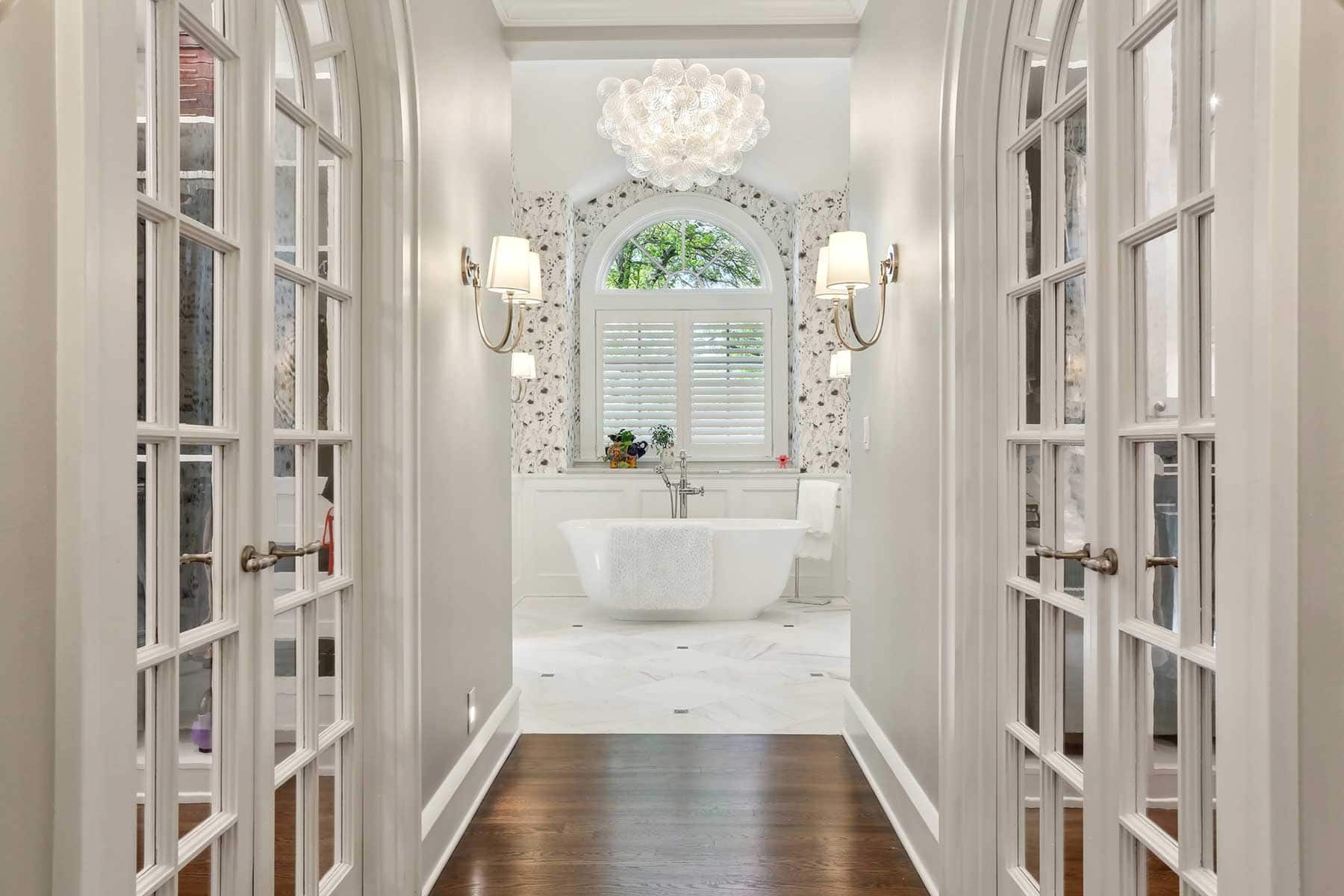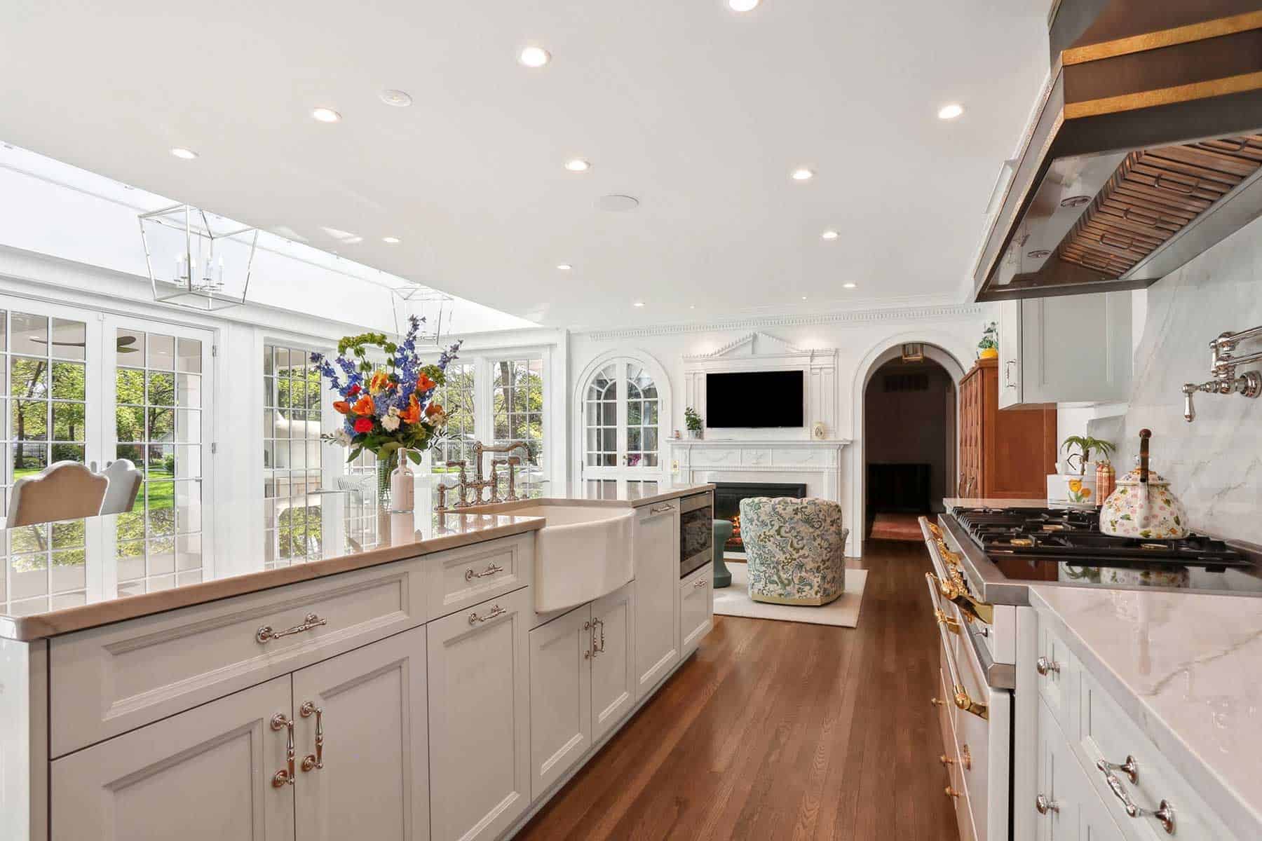 Throughout the home, original plaster moldings and hardwood floors have been preserved and extended into new additions. Even details from the home’s basement, such as unused arched doors, have been repurposed to enhance the primary suite and closets, ensuring continuity across time.