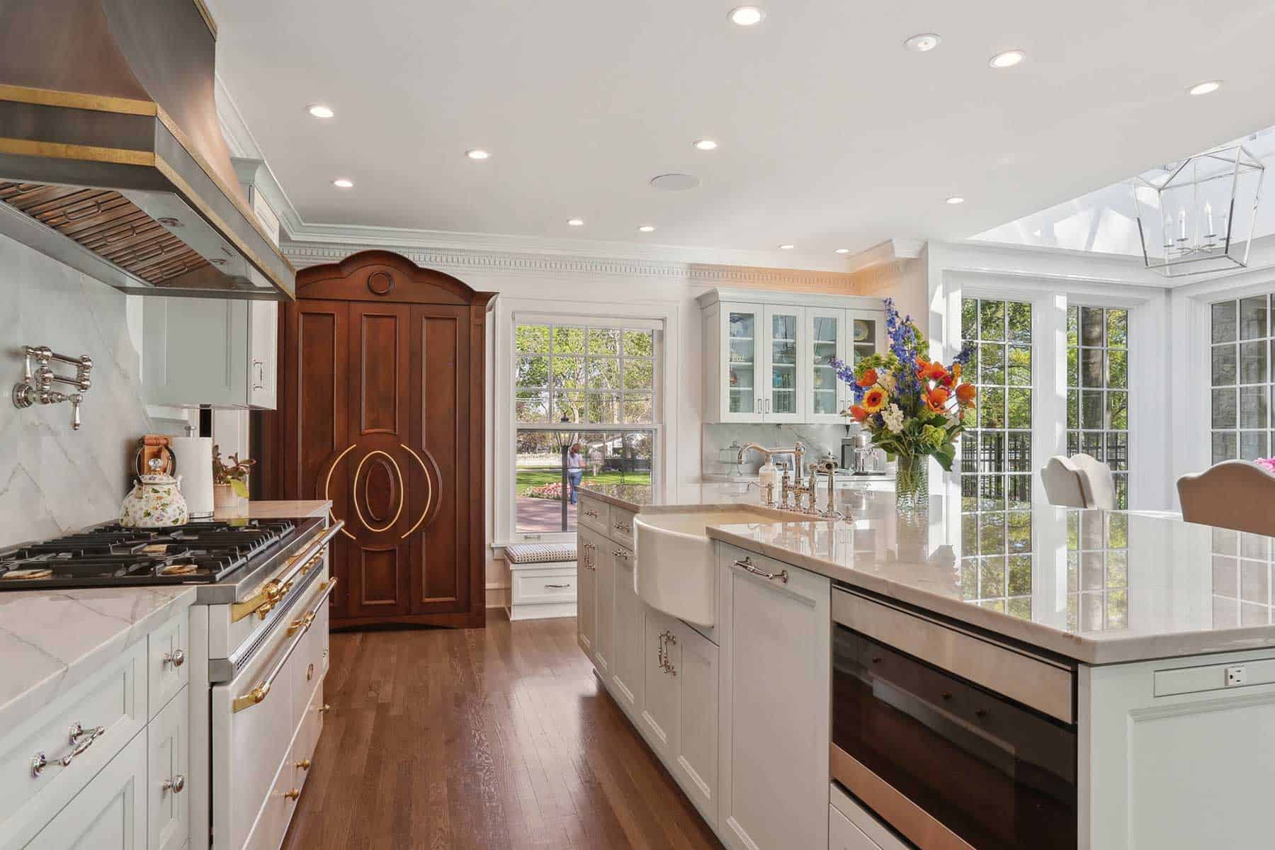 At the heart of the transformation lies a story—not just of renovation, but of legacy. The homeowners approached the project as caretakers of both memories and materials. The renovation was a chance to bring it into the modern era without erasing its past (or quaint details such as the original pond, stone benches, and chicken coop). The last major renovation was in the early 1960s; this time, the work was more ambitious. It included a full HVAC installation, all-new electrical, and even a rebuilt garage that mirrors the dormers and dentil molding of the original home.