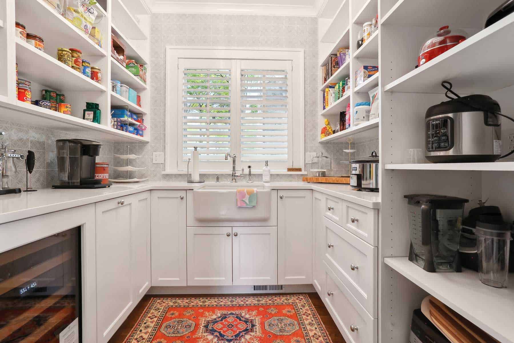 Through a preserved original arched door lies a newly constructed pantry room, which provides another nod to balance between past and present. This second kitchen area offers open shelving for pantry goods and small appliances, a secondary farmhouse sink, wine fridge, and additional prep space, all dressed in a crisp palette of white and soft gray.