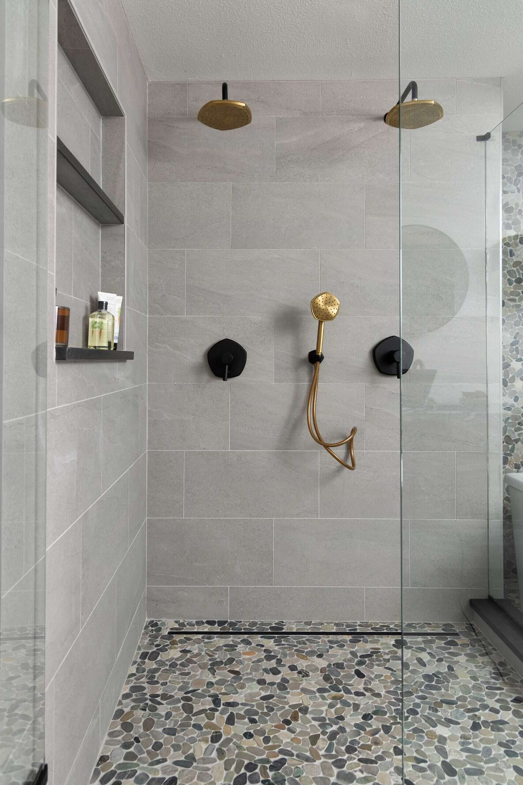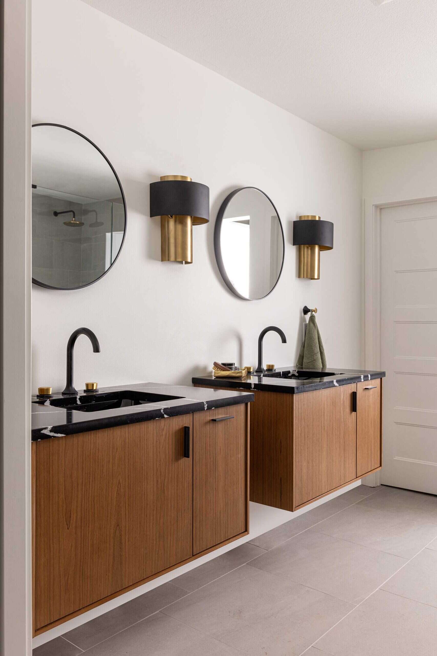 Two floating wood cabinets and a double rain shower wrapped in large-format tile complete the space.