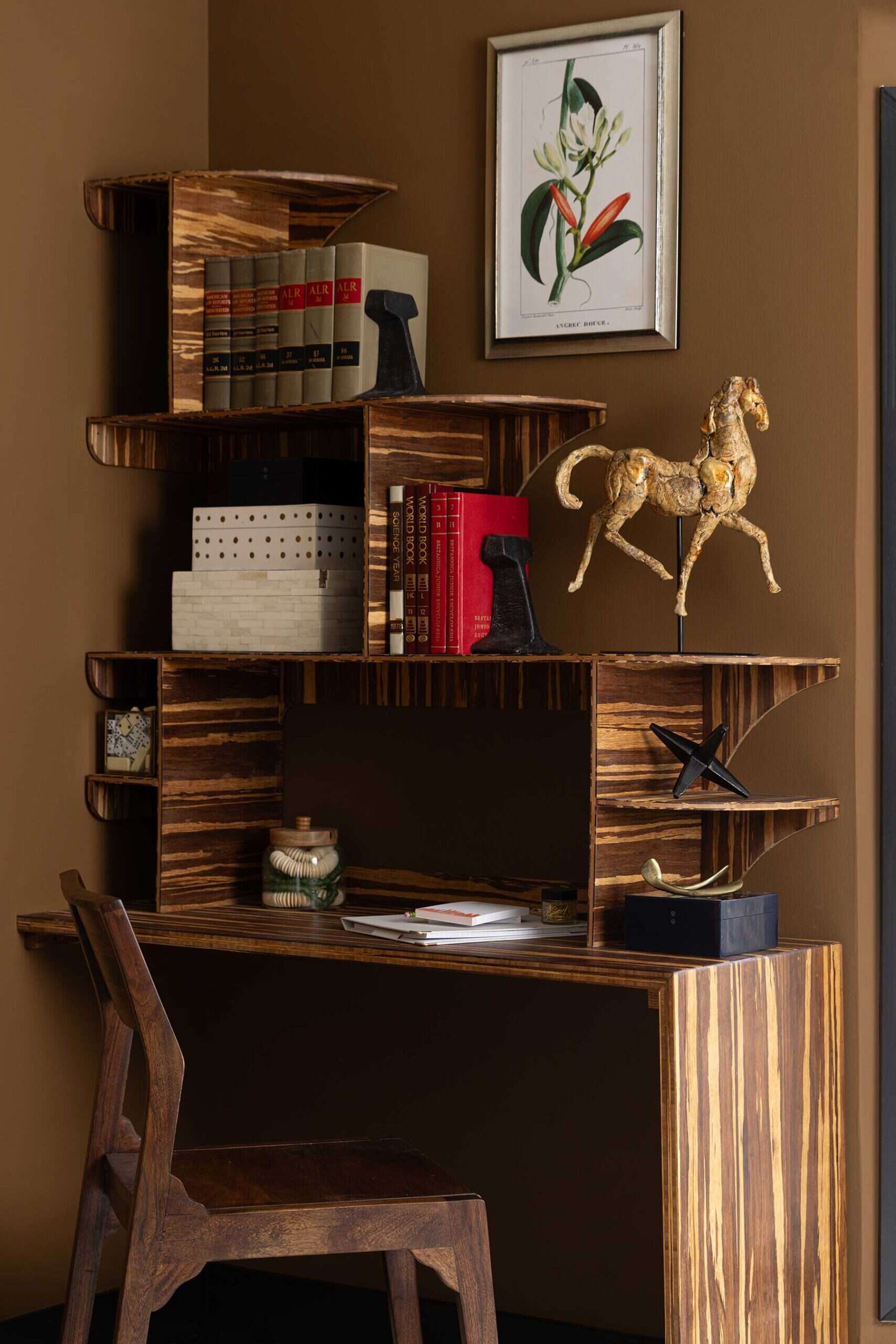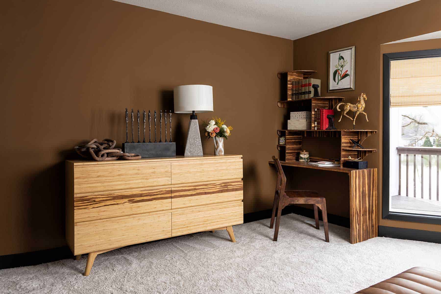 In the primary bedroom, a praline color punctuated with black trim creates a comfortable and tailored foundation for the custom pieces that Tamara made for the space. First, a graphic zebra wood desk climbs a corner on one side of the windows, affording a beautiful view to work by. Additionally, Tamara built a wall-to-wall channeled velvet headboard with two zebra wood nightstands. To save surface space on the nightstands, she hung a pair of modern brass and black pendants, threading in the black detail to tie in the trim.