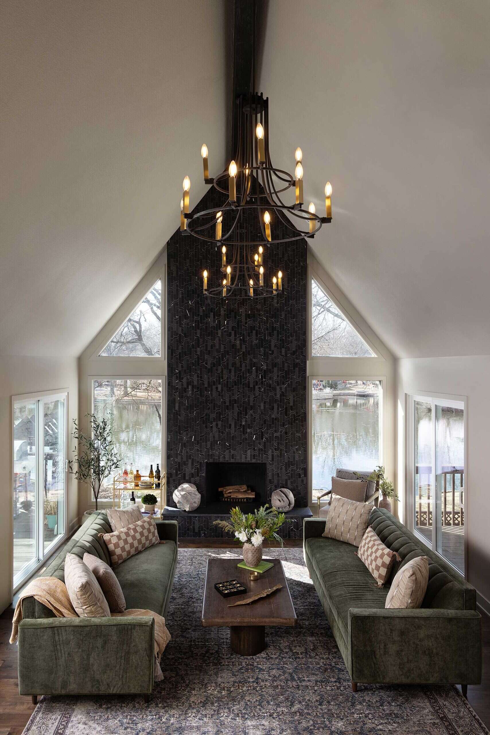 Once the demolition was complete, Tamara began implementing her concept. For the great room, she selected a black marble mosaic tile with alternating flat and polished surfaces. The curvature and reflective value of the stone pieces have a tonal impact and somehow feel light, while the scale gives substantial visual weight that anchors the room. The large windows on either side of the fireplace provide a calming view of the lake. The room is finished with furnishings in a soothing mix of greens and neutrals against the backdrop of a quiet beige wall color.