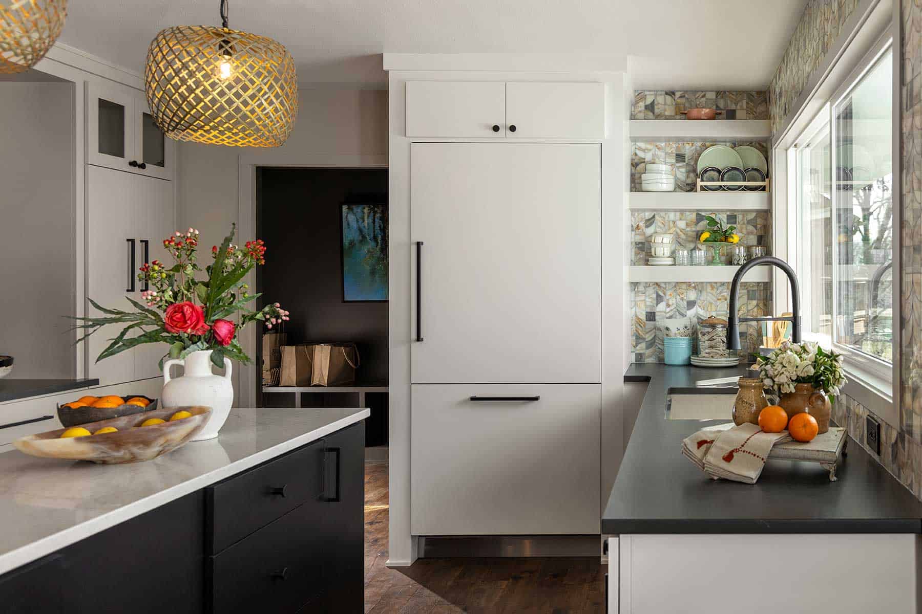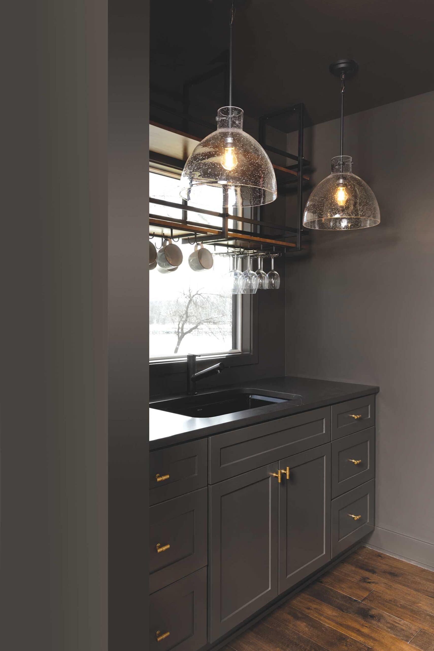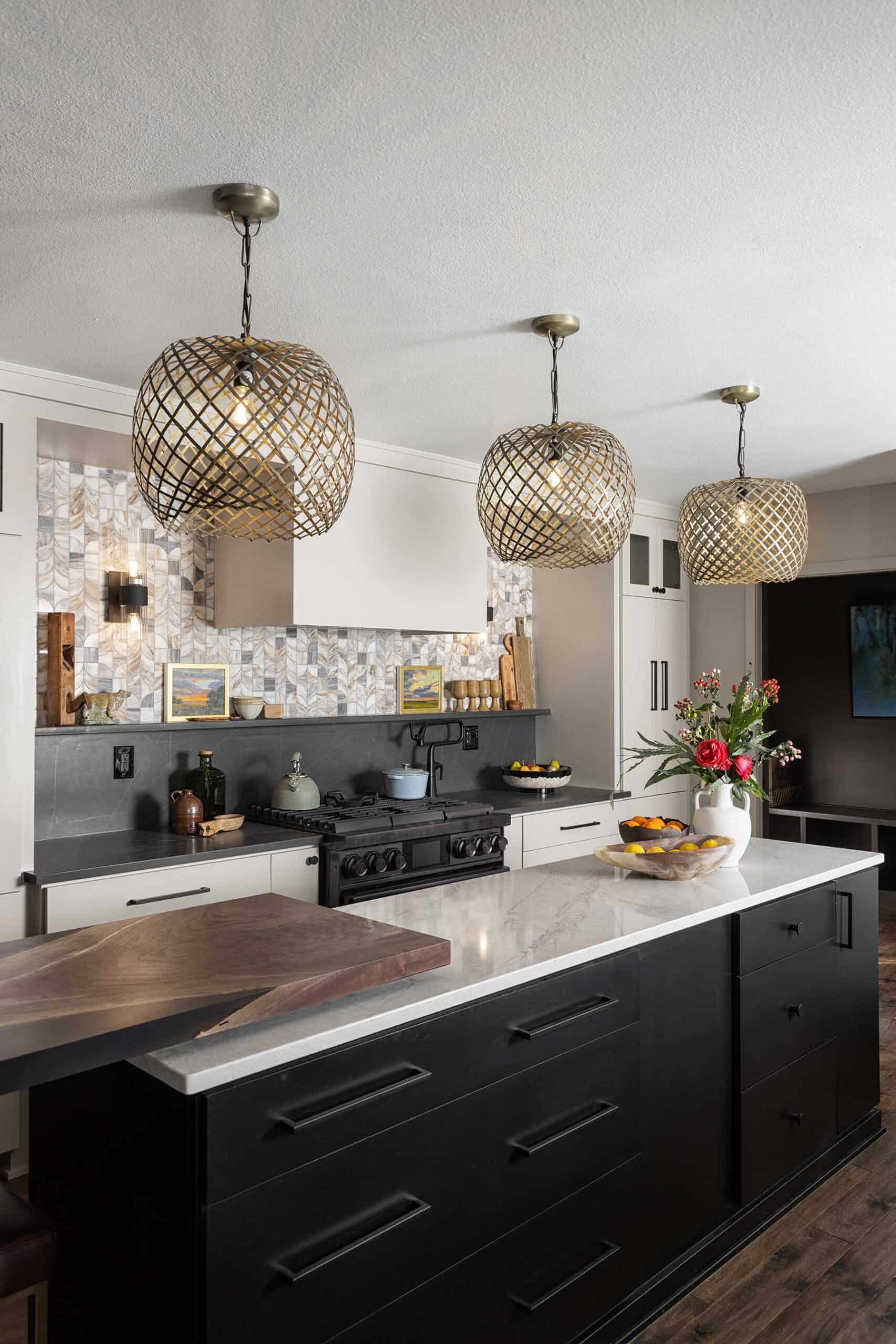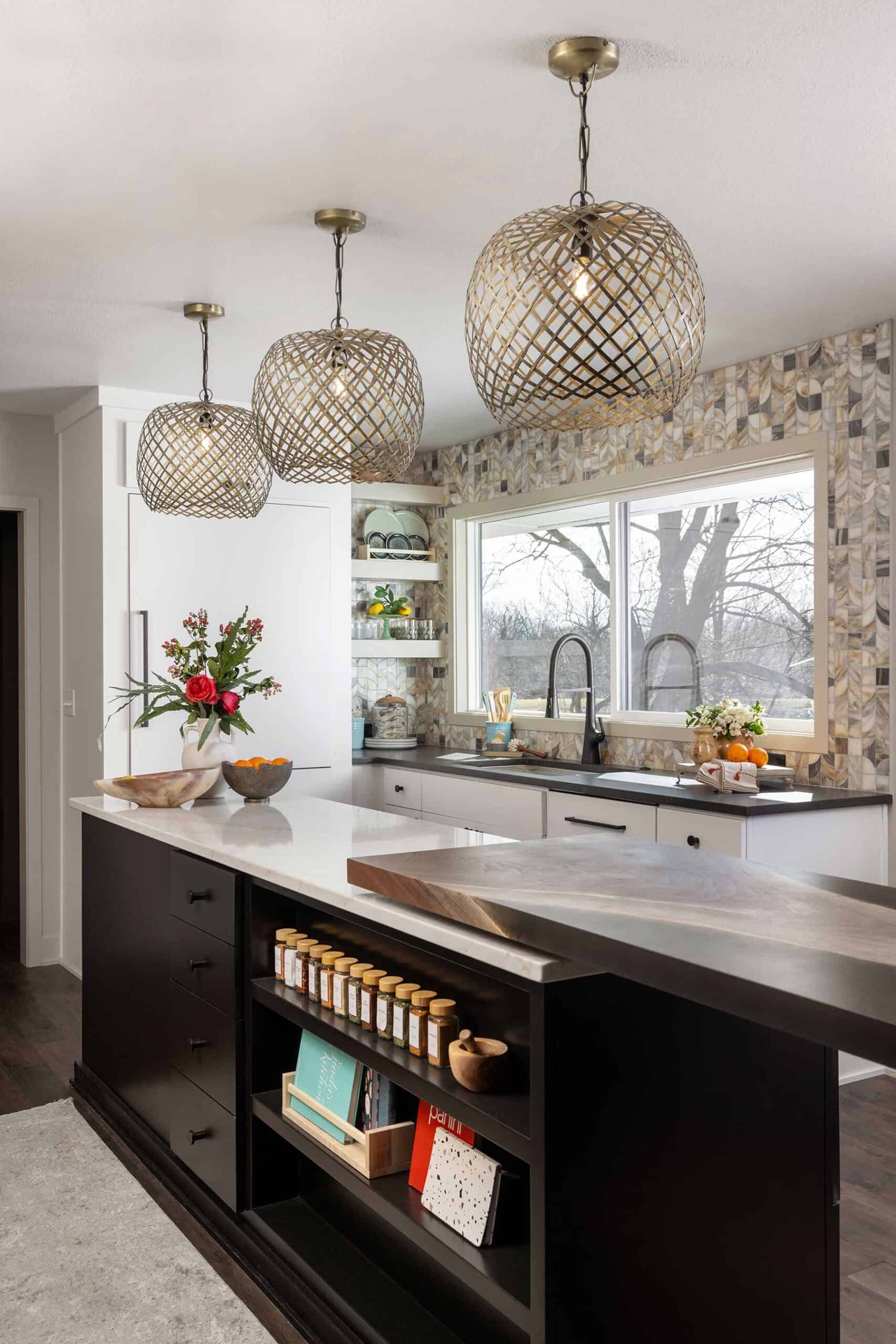 In another creative turn, Tamara customized a quartz-topped storage island with the addition of a walnut slab that pivots to serve as a buffet. Tamara worked with KC Custom Hardwoods to select and fabricate the slab, which was once a tree here in the metro. Encased in a smoky black epoxy, it’s a stunning focal point that adds warmth and originality to the space. Above it, three woven brass light fixtures add more texture and interest.
