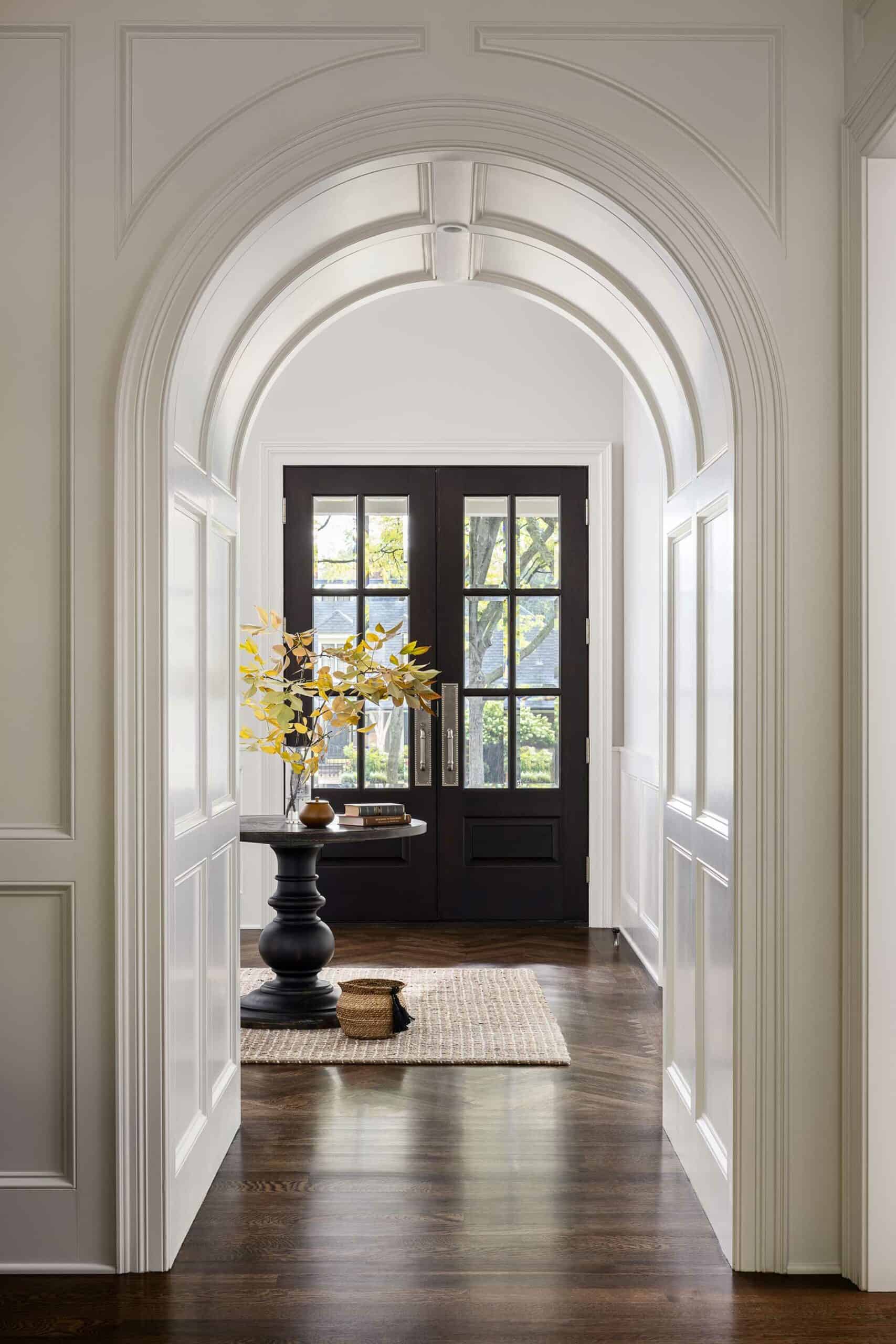The home’s color palette incorporates shades with neutral undertones—gray for the library, charcoal navy for the laundry and a muted forest green for the butlery and basement bathroom. These choices help break up the monotony of white and walnut cabinetry throughout and will pair well with future design updates. Varied finishes—crystal knobs on the main level; polished nickel in the primary bathroom; aged brass in the kitchen, bar and laundry; and matte black in the boys’ bathrooms—were used strategically throughout the home to give it a sense of having naturally evolved. Each living space, bedroom and bathroom stands out with its own unique ambiance and style while seamlessly integrating into the whole design.