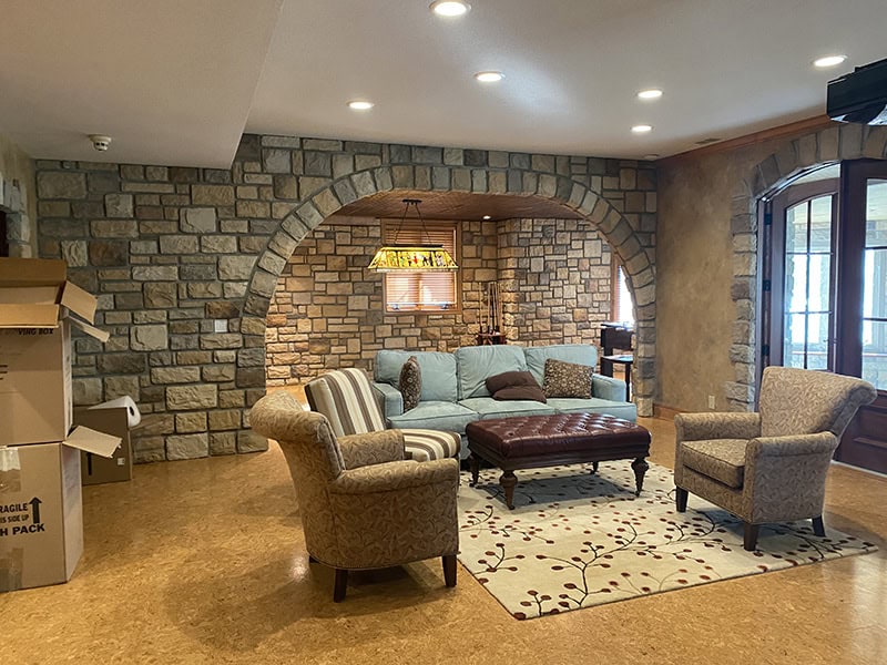 Picturing an opulent space with speakeasy vibes, the design team sought to transform the clients’ lower level into a moody, 1920s-inspired retreat with a dedicated theater, bar and seating areas. The project’s biggest challenges included incorporating existing windows, reusing a beloved beam, integrating tin ceiling tiles and maximizing under-stair space. Every element of the space was carefully curated to give a nod to a time gone by—with velvet drapery, antique back bar mirrors and custom brass foot rails being prime examples. The design team’s solutions involved creating hollow surrounds with sandblasted lens glass to conceal LED strips and adding full-surround illumination on the bar and wine-cellar shelving.