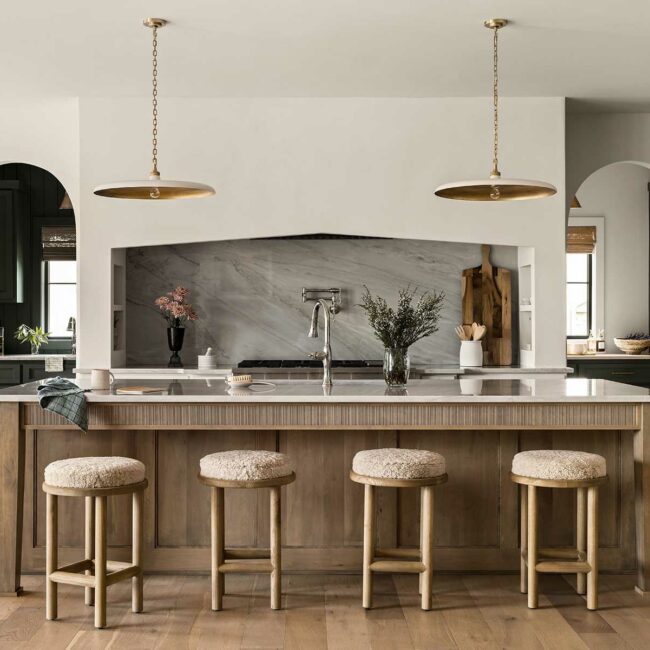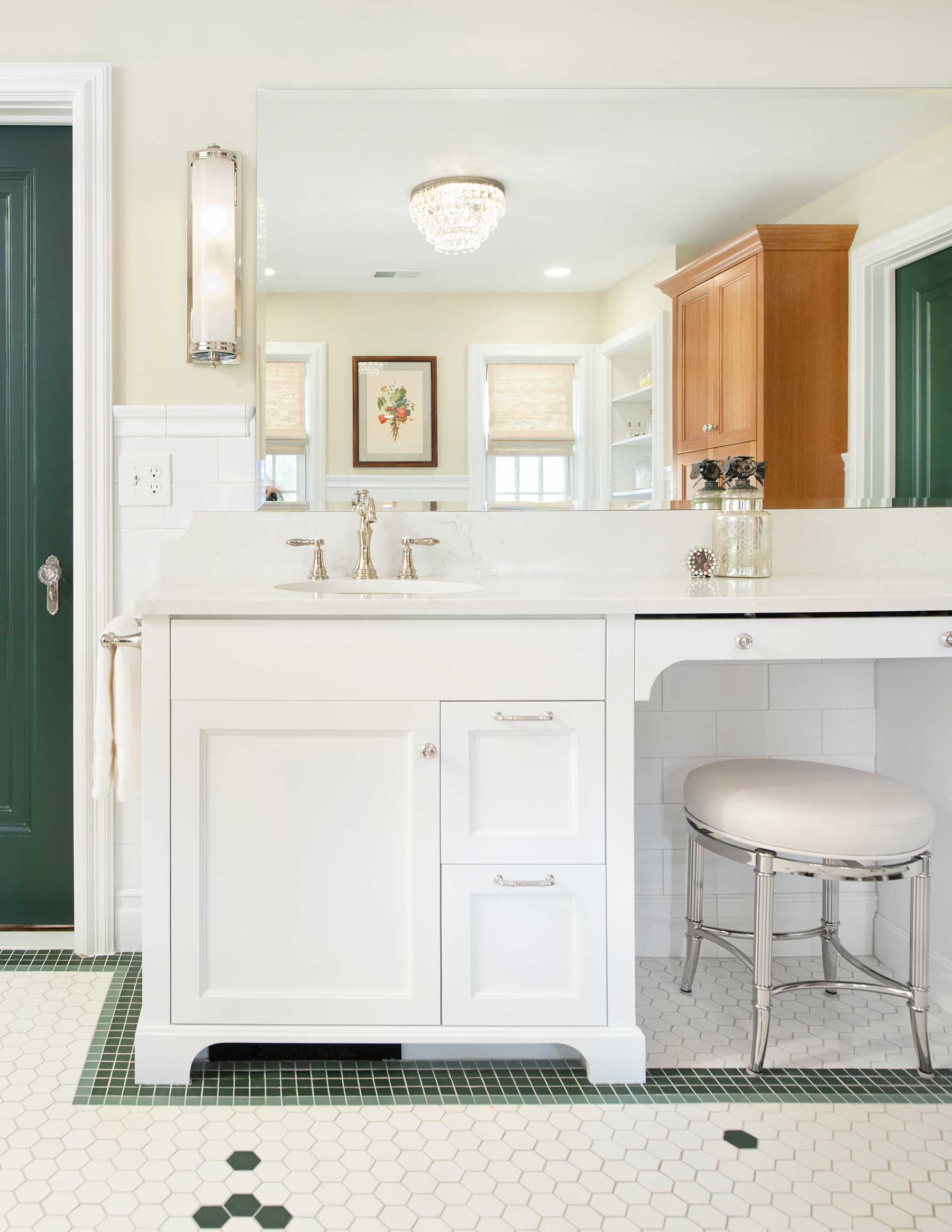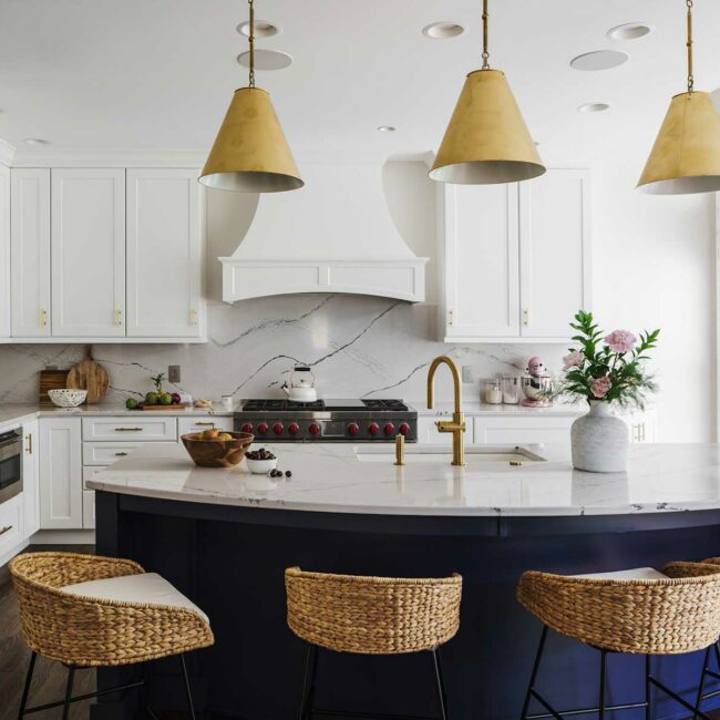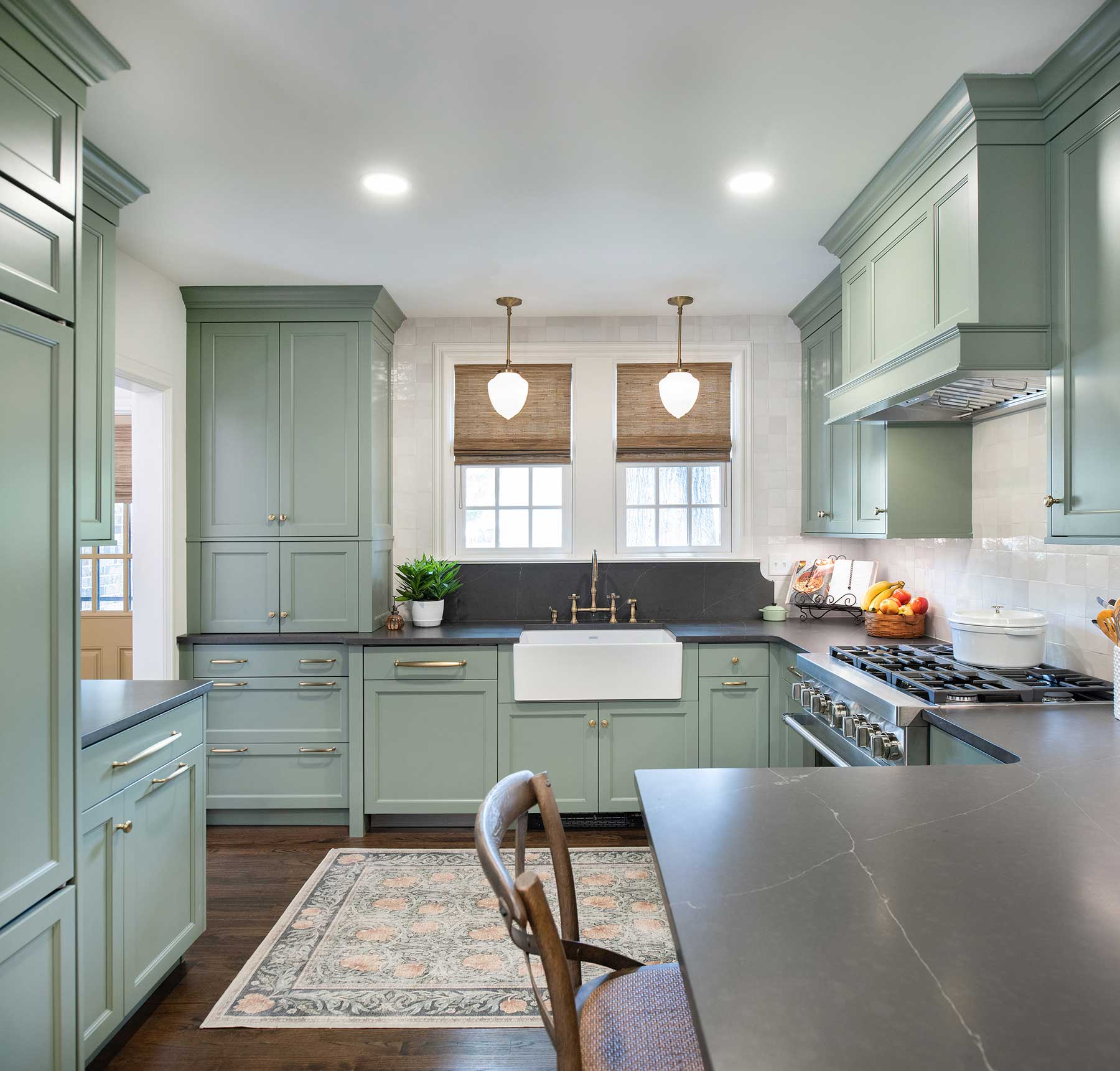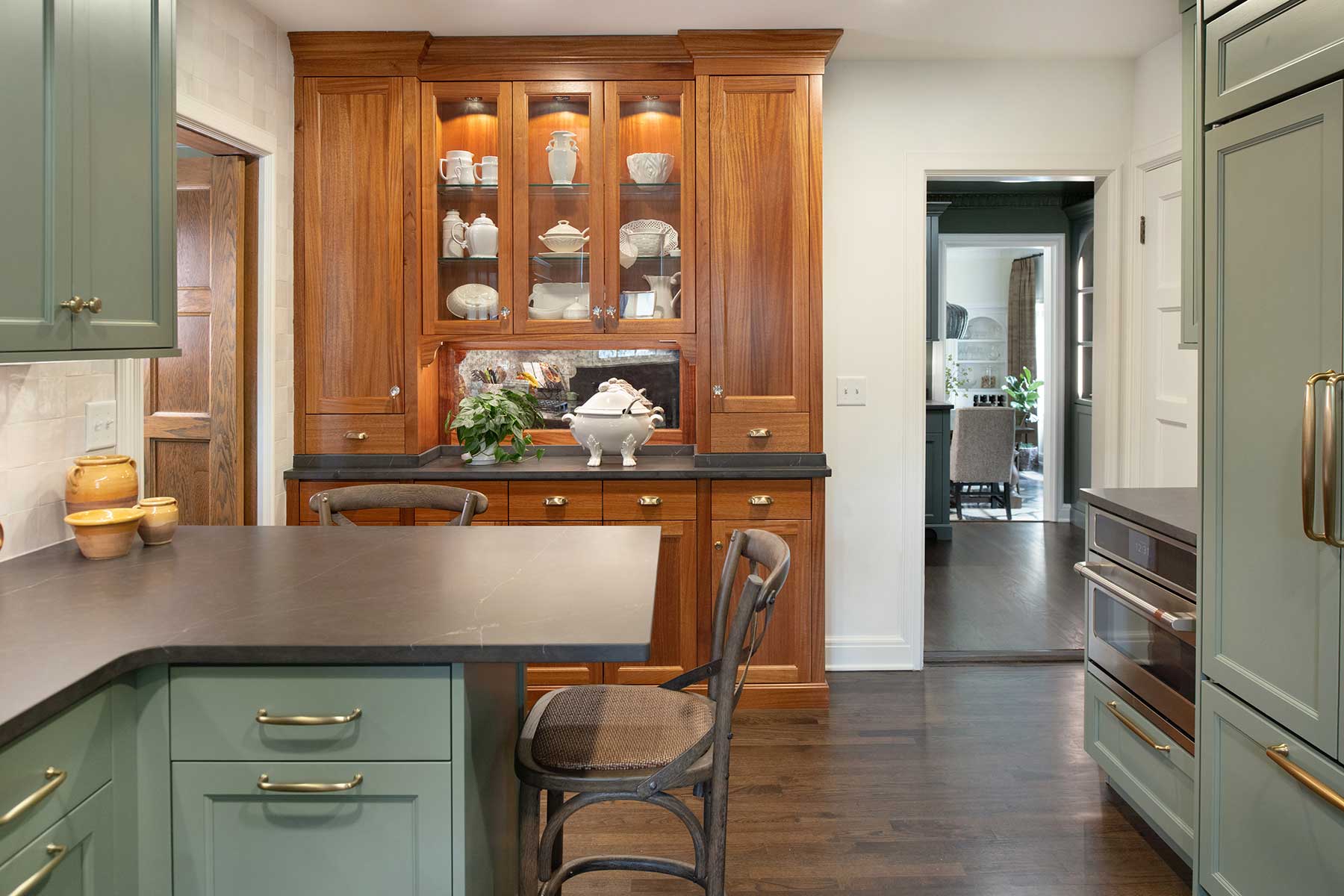 On the wishlist was a full powder bath on the main level, so the design team replaced what was a small breakfast room to add that—plus a butler’s pantry—into the floor plan. The kitchen underwent a total rework, eliminating the bulky island in favor of a space-saving peninsula for seating. Another new yet unexpected addition is the stunning mahogany hutch, designed to store all the homeowner’s serving ware. The remaining cabinetry is painted a bold yet muted green that complements the creamy, four-by-four-inch backsplash tile and lovely dark-toned quartz countertops. The team incorporated stunning new lighting to complete the kitchen’s fresh look.