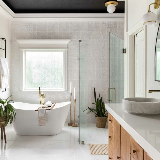 Bath Monochromatic Master For this bathroom remodel, Little Black Dresser Interiors added monochromatic tile with black-and-white Zellige subway tile. On one wall, the tile lays in a unique striped pattern