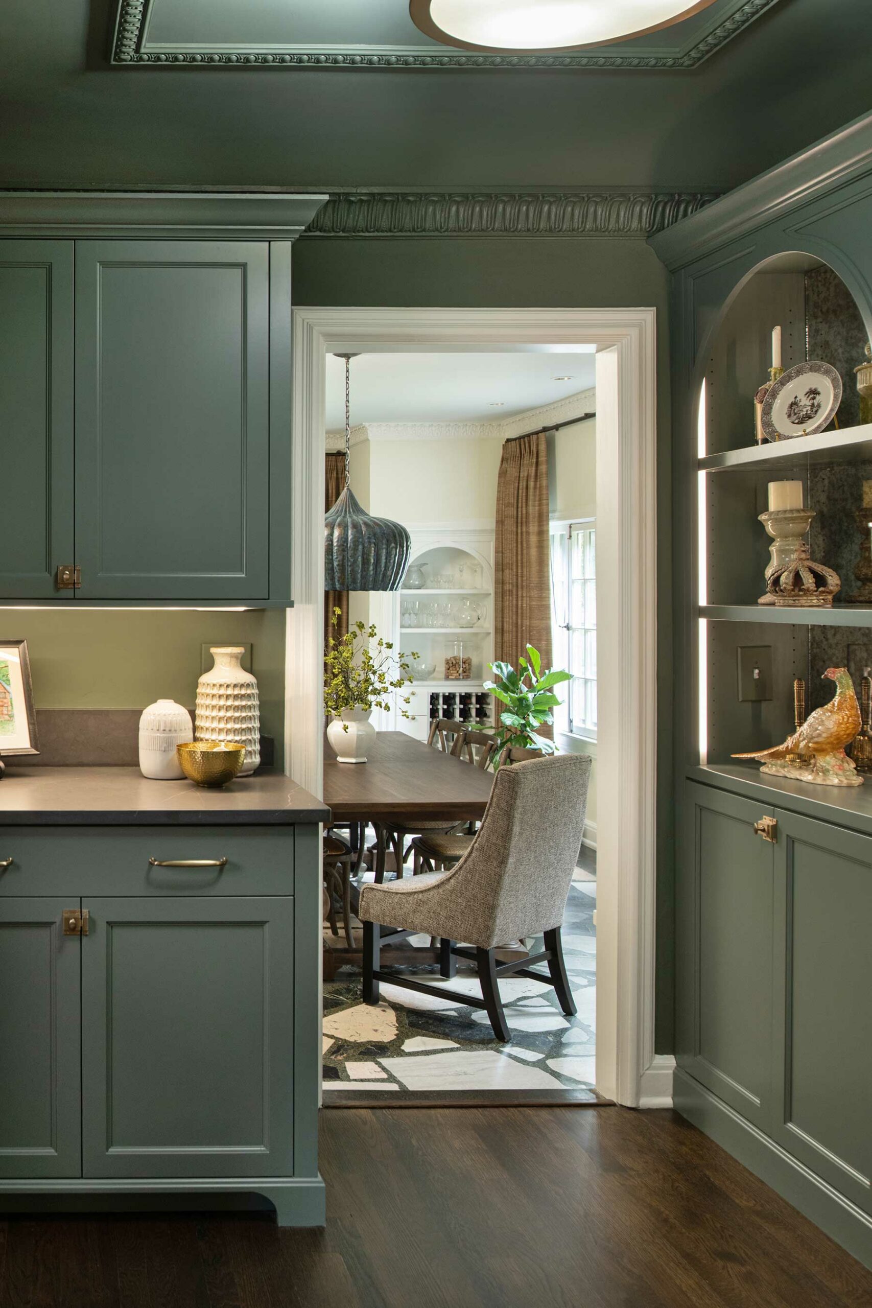 Meanwhile, the updated butler’s pantry features a darker shade of green and incorporates arched built-ins with an antique mirror and lighting for a dramatic focal point. The contractor also recreated the cove ceiling detail that had been a part of the old breakfast nook. In the nearby powder bath, an iconic William Morris wallpaper and an adorable pendant light adorn the space.