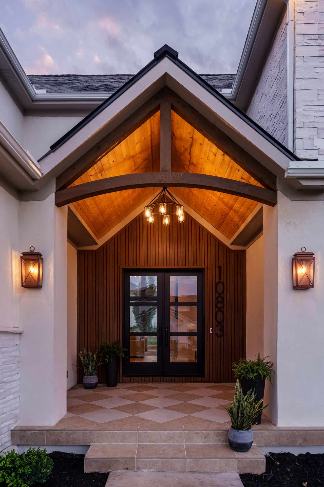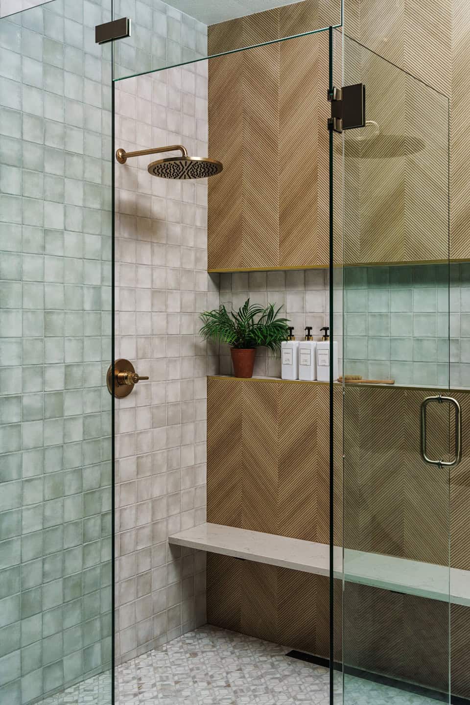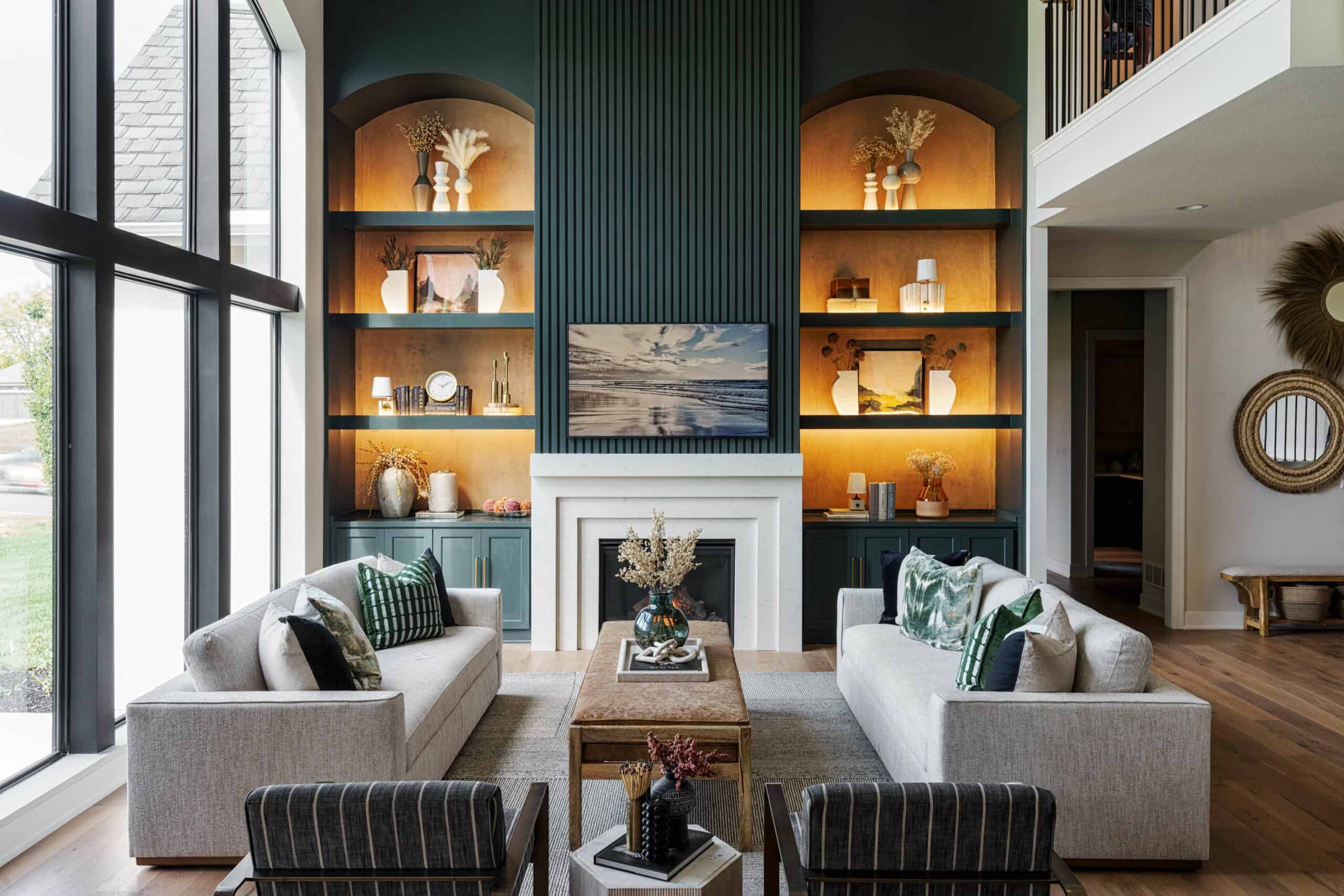 Inside, the designers used wood and earth tones in distinctive ways, especially in the kitchen and great room. Highlights in the great room include a custom stone fireplace surround flanked by deep-green shelving with a stained wood backer and slatted fireplace trim. In the show-stopping kitchen, wall-to-wall glass cabinets are a clever draw. The primary suite continues the wood theme with beautiful beams, trendy shower tile, wall features and a black-painted ceiling.