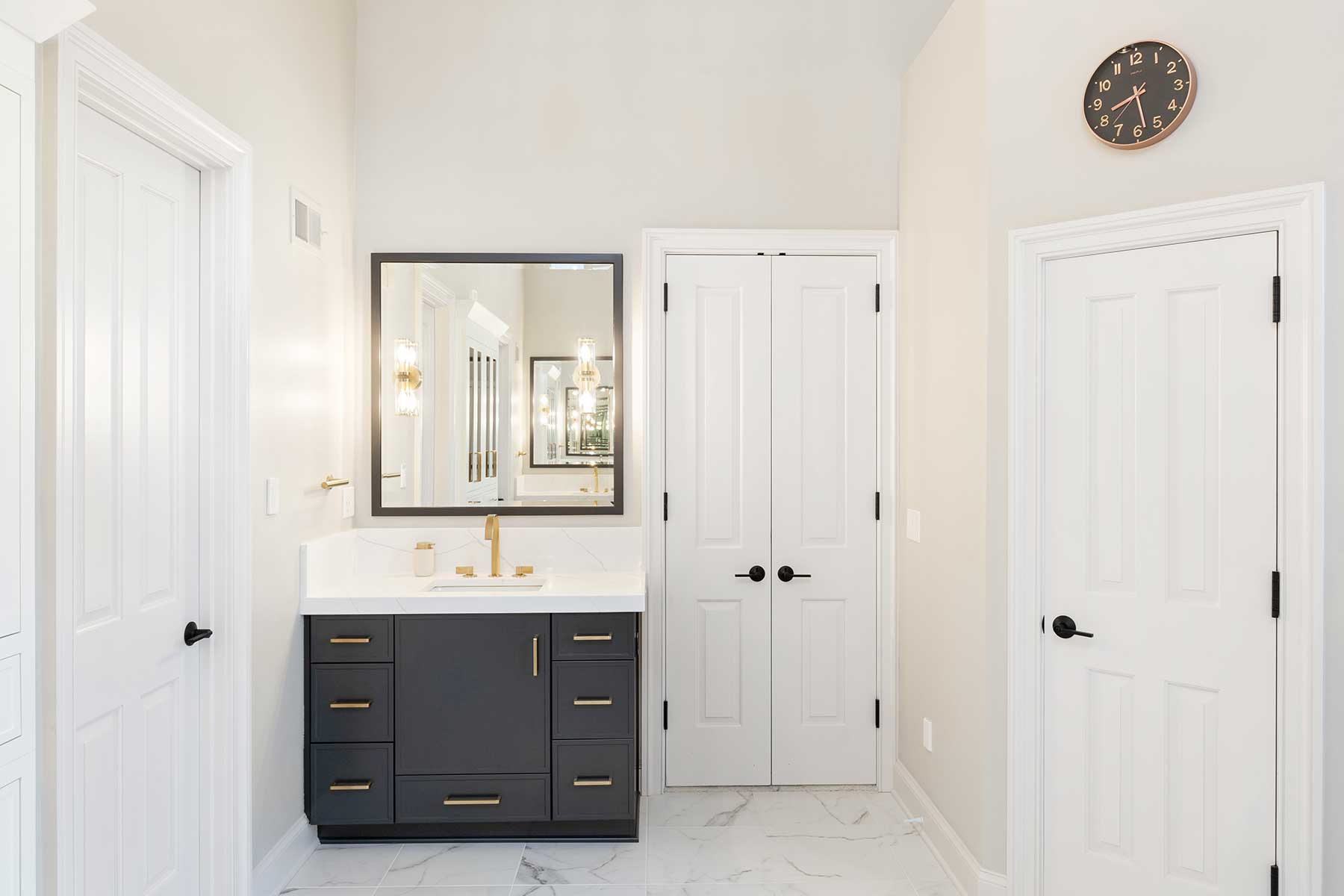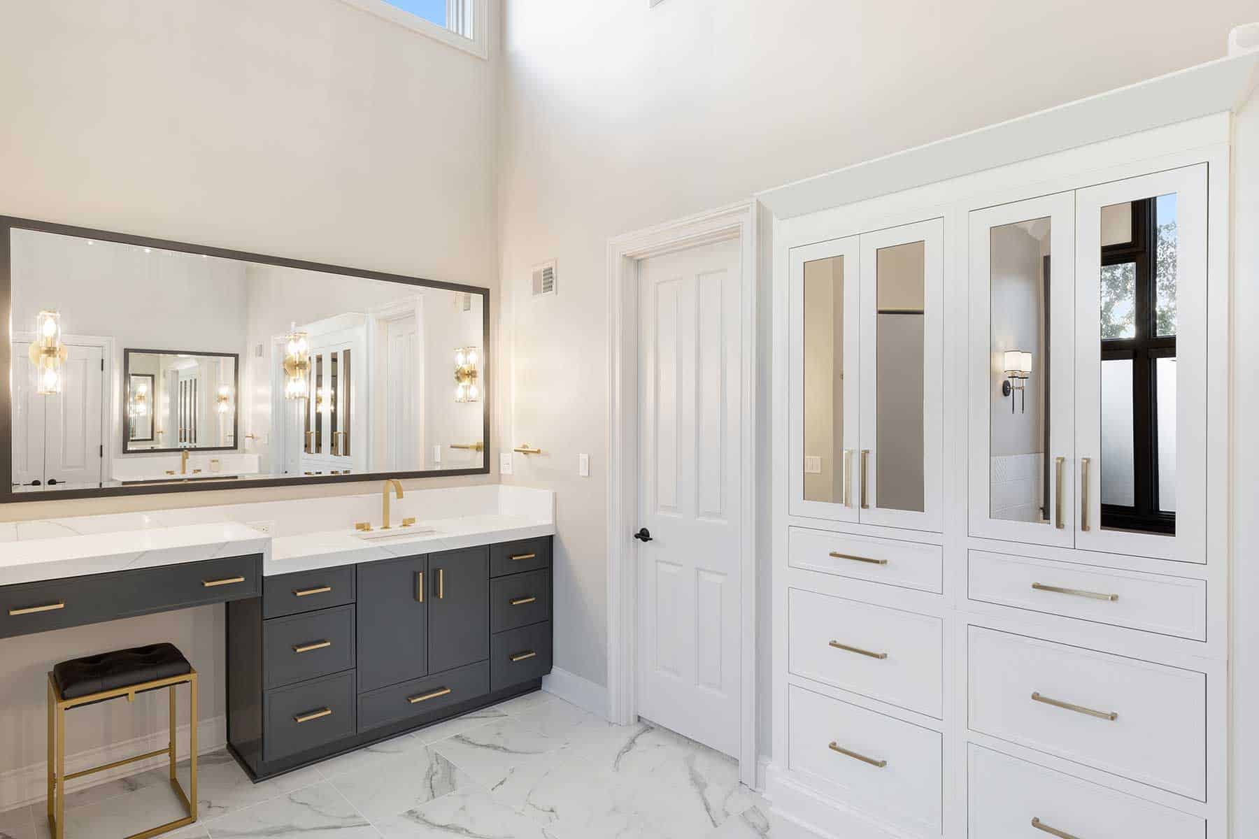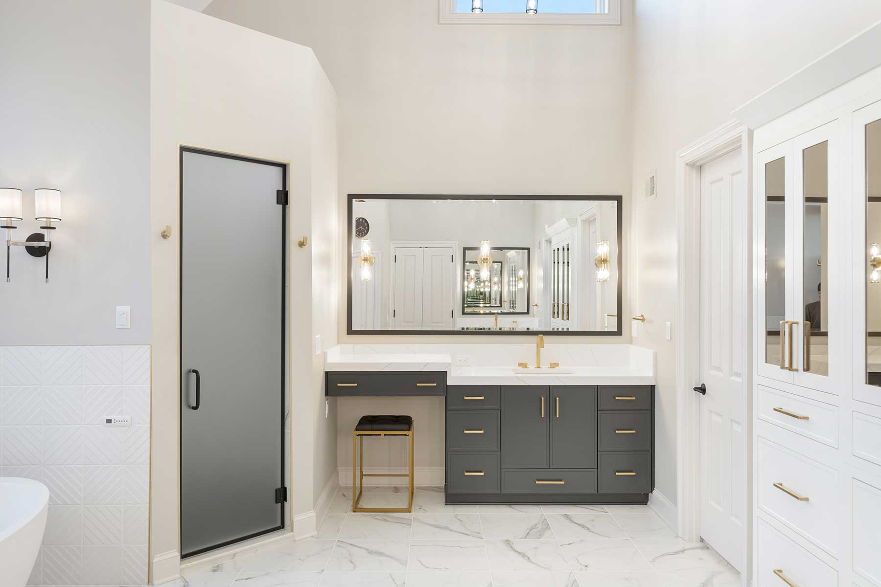 Their clients’ specific storage needs required innovation, too. The linen cabinet’s prominent placement was also a potential focal point. So, to create the storage their clients needed and to maintain the aesthetic of the space, they created a custom built-in look for the cabinet by using creative carpentry and added tinted bronze mirrors to bring moodiness to the space.