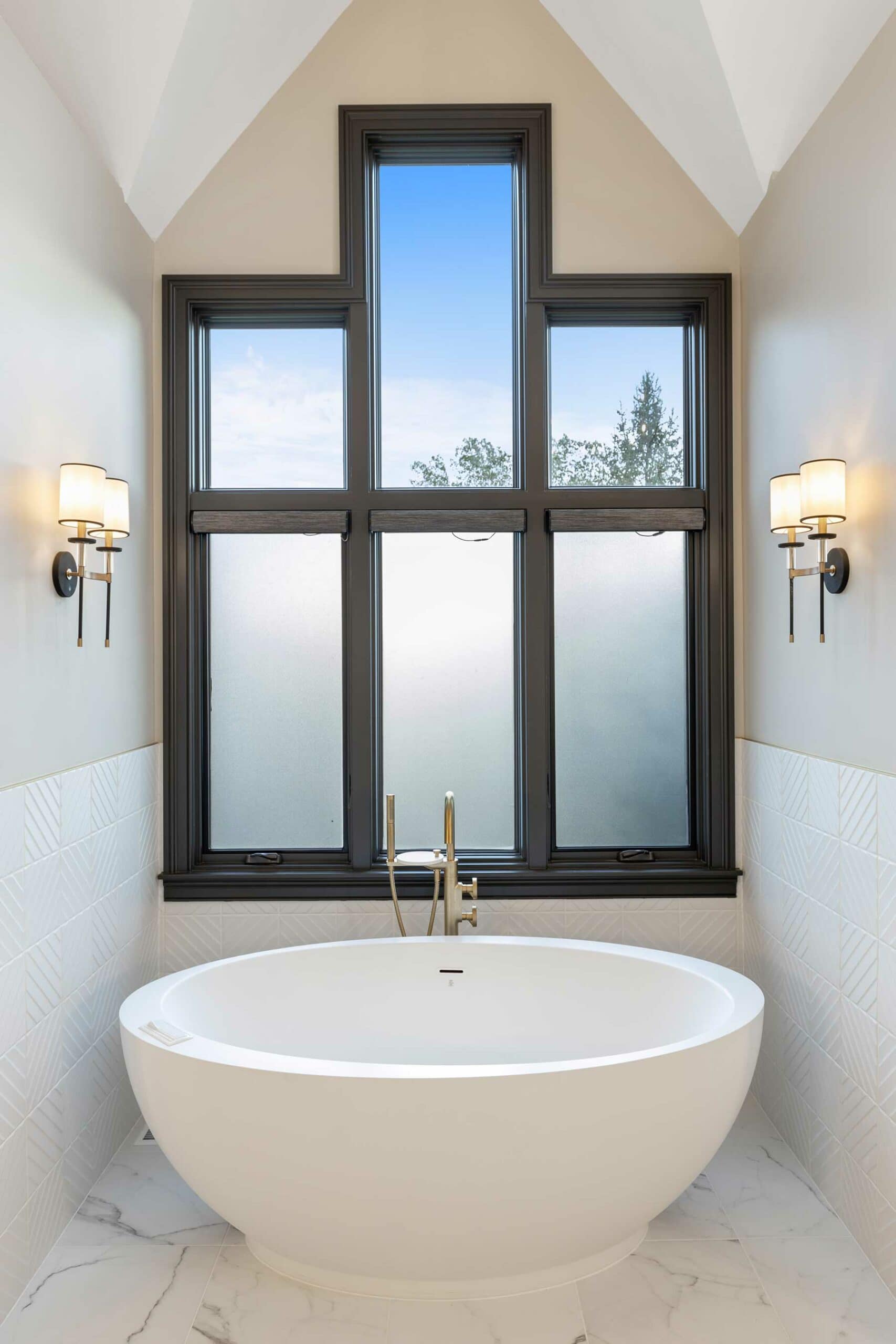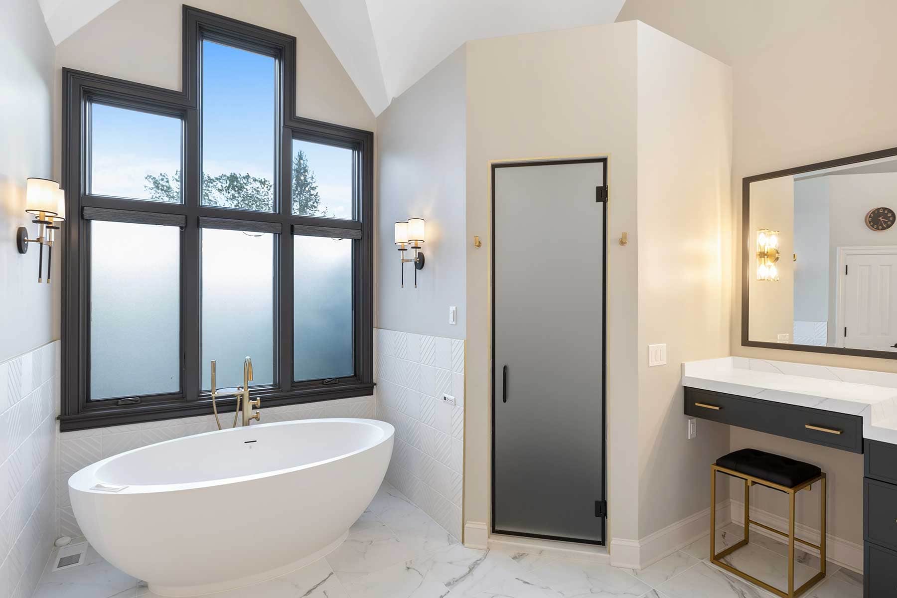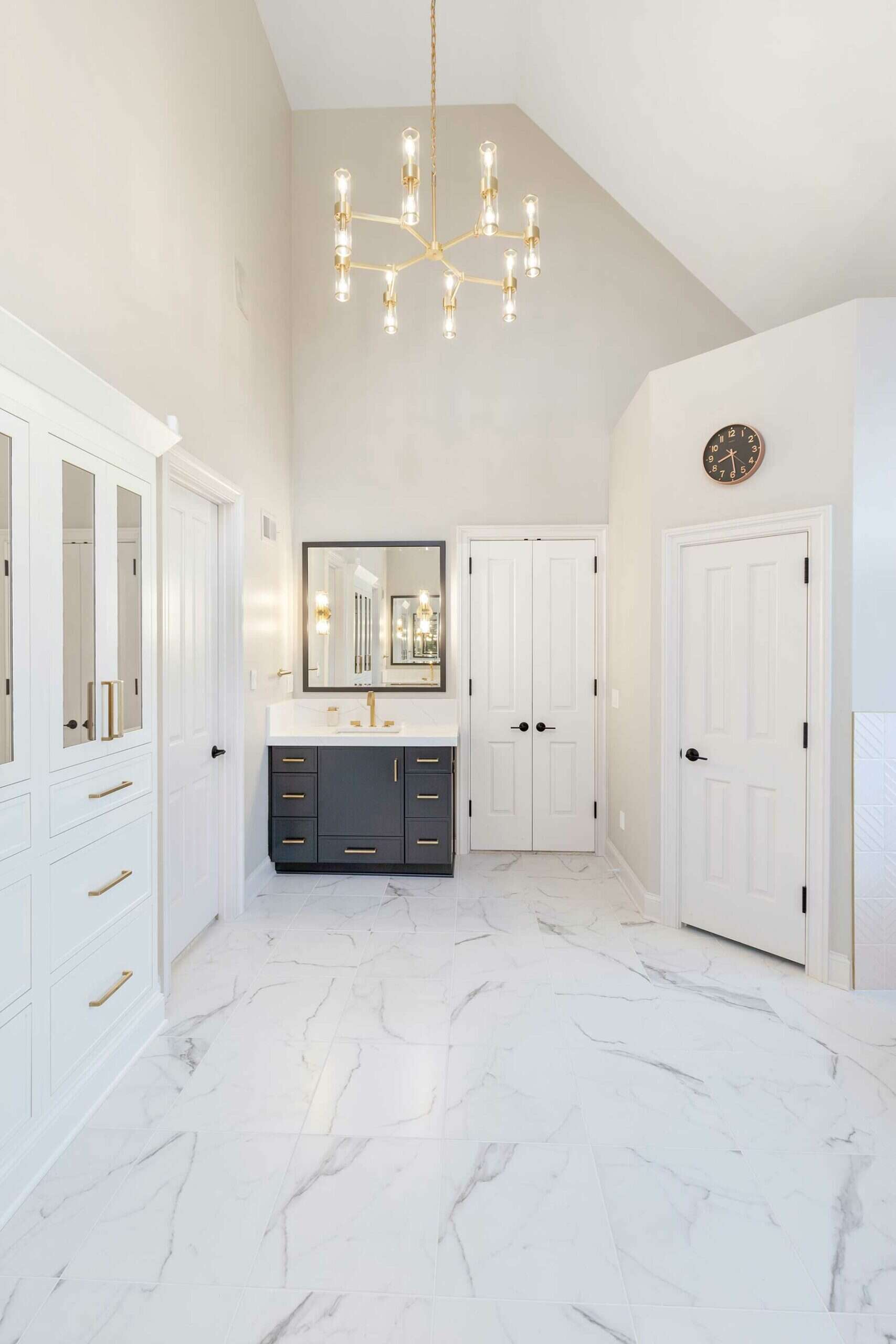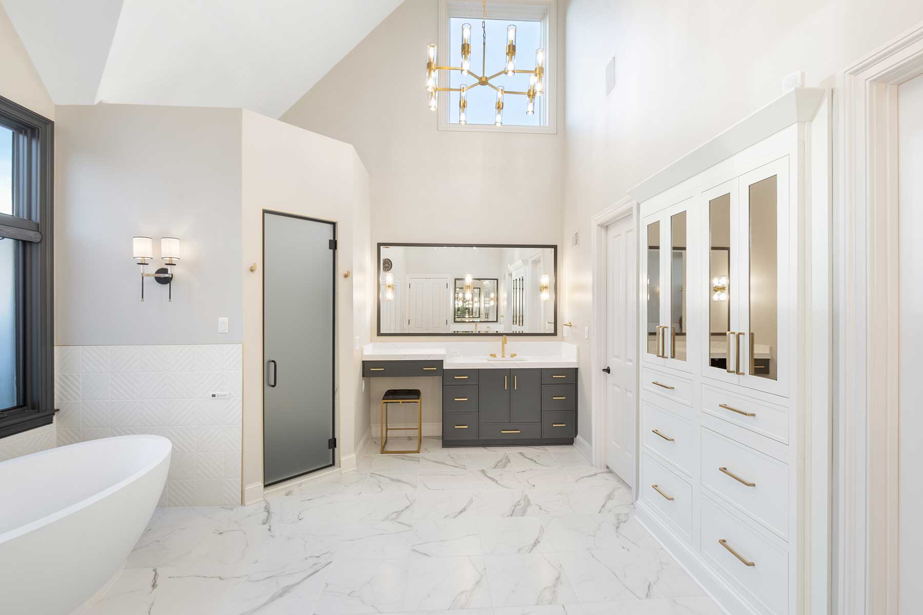 Their clients’ specific storage needs required innovation, too. The linen cabinet’s prominent placement was also a potential focal point. So, to create the storage their clients needed and to maintain the aesthetic of the space, they created a custom built-in look for the cabinet by using creative carpentry and added tinted bronze mirrors to bring moodiness to the space.