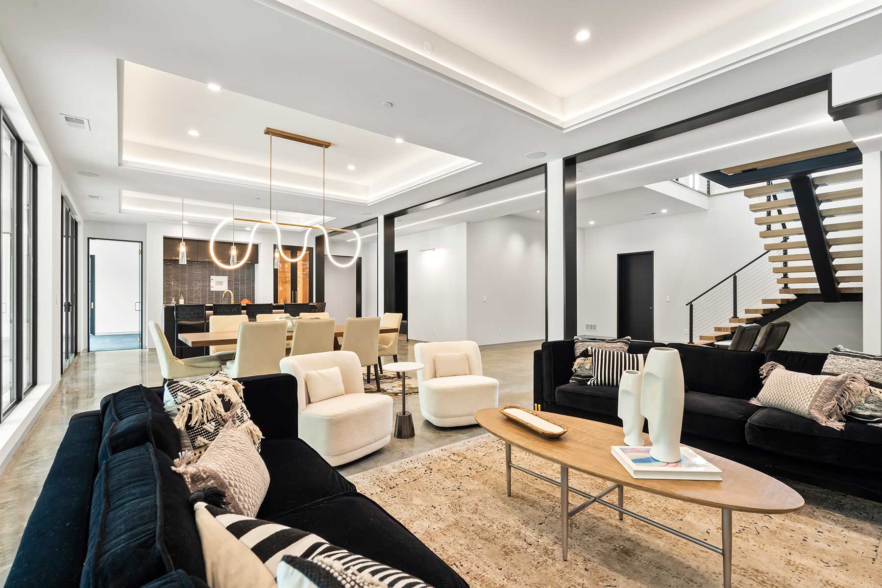 The vision for this custom home revolved around the client’s desire for privacy, warm contemporary design and the ability to take advantage of the property’s incredible views. They visualized a place where their family could easily gather and enjoy the spacious floor plan. The 10-acre lot features an ideal location, so incorporating views of the expansive property into each room was a top priority. Given its purpose as a future entertainment hub, the home was designed to include dedicated space for occasional chef stays and various pet amenities for the dog-friendly family. Overall, this design masterfully combines modern style, family-centric features and a seamless connection to nature.