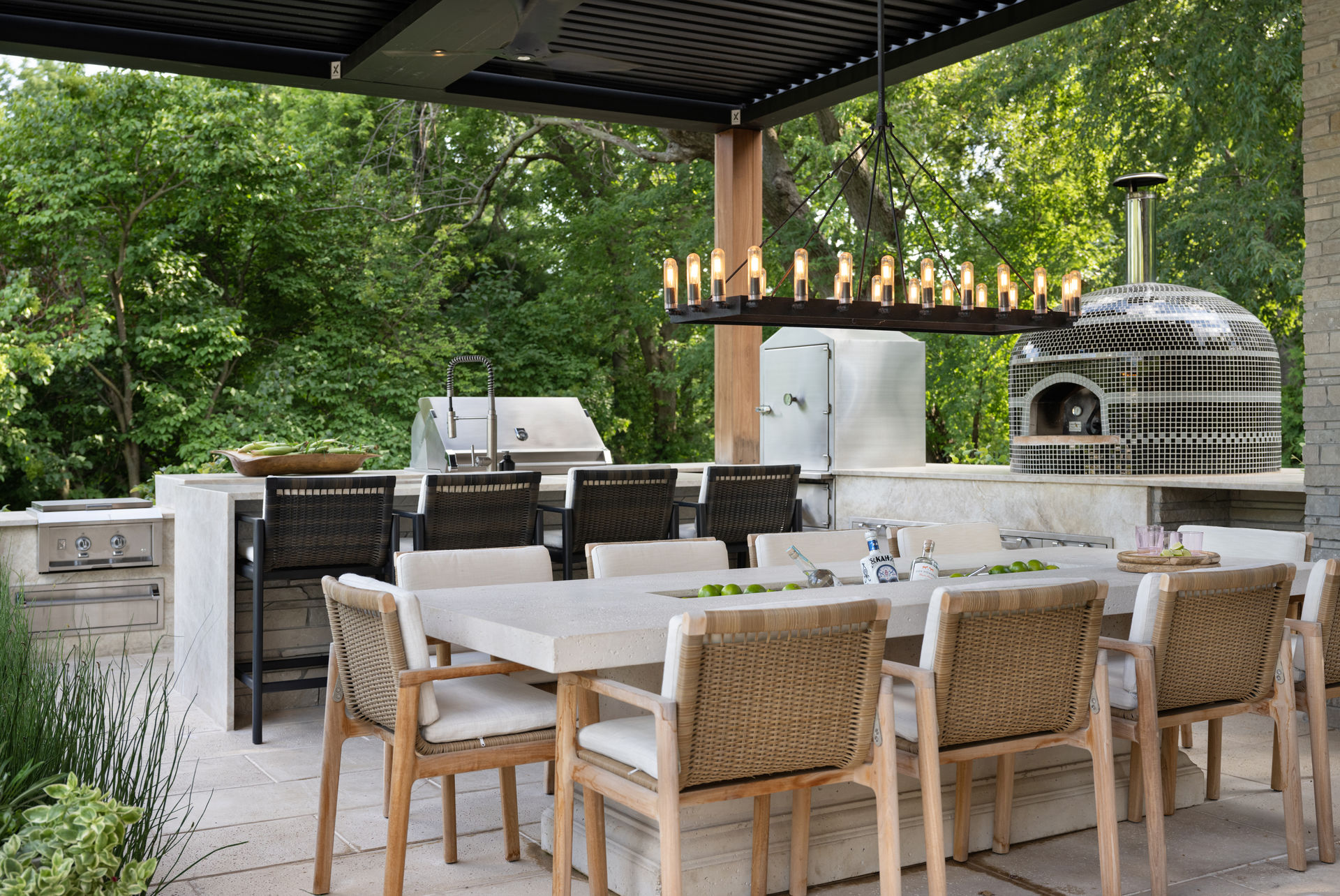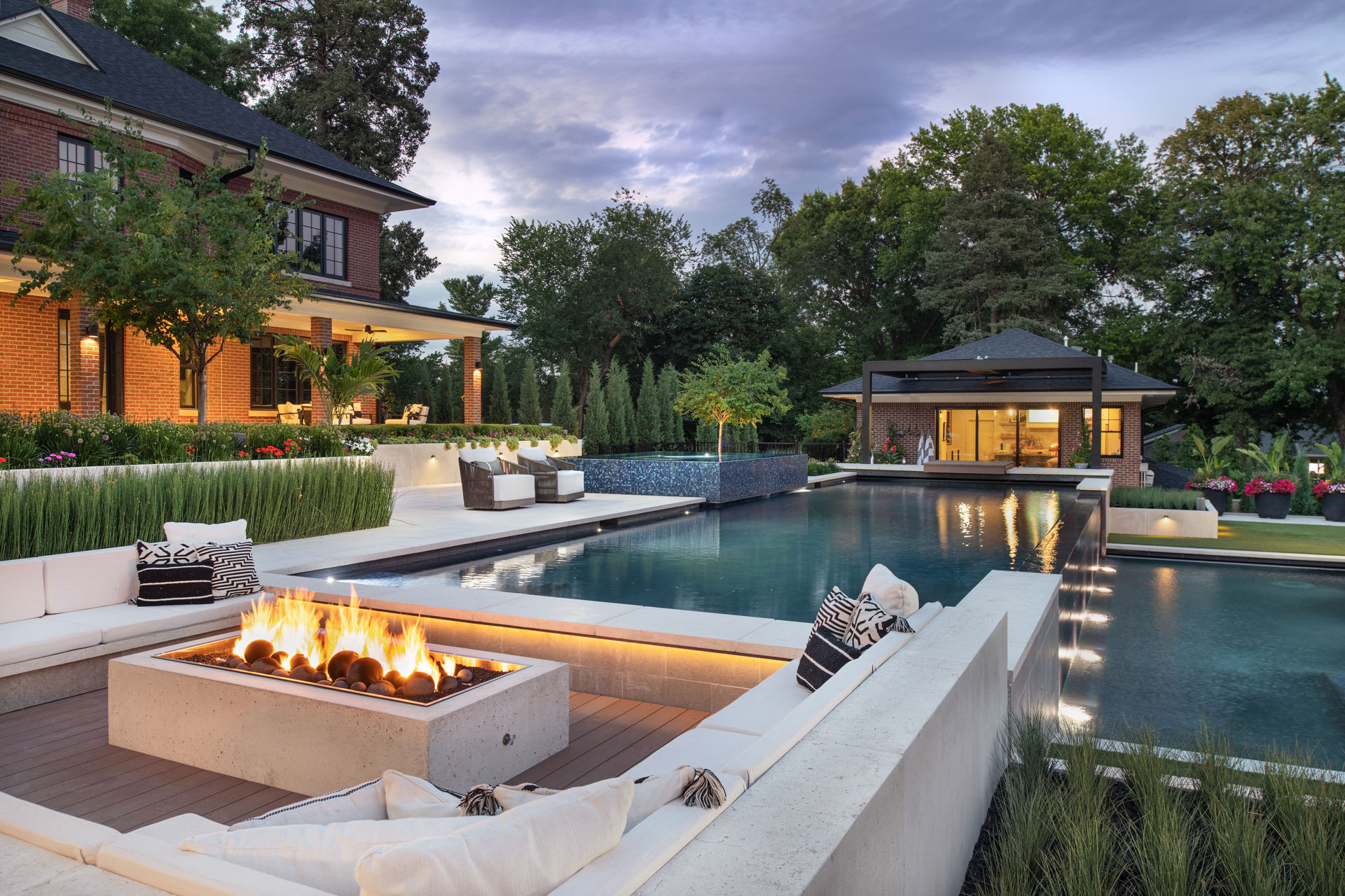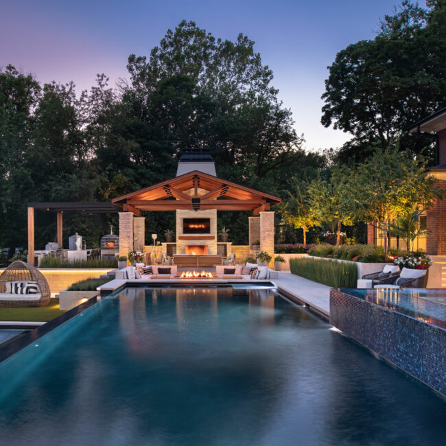 Contemporary details in outdoor living are blended with the historic home as a backdrop in this ultra-luxurious, multi-tiered entertainment space. The client requested a full spectrum of program elements, including a covered outdoor living space with a fireplace and a full outdoor kitchen, a guest/pool house, an upper and lower pool, a spa, a swim-up bar ledge, a sunken fire pit and multiple lounging spaces. The backyard’s sloped hill made the terrain unusable for this vision, so the design team’s biggest challenge was to flatten the earth and create functional yet beautiful spaces. They addressed the dramatic grade changes by using terraces, expanding the usable space and creating various outdoor rooms, which resulted in a dynamic, party-ready space from every angle.