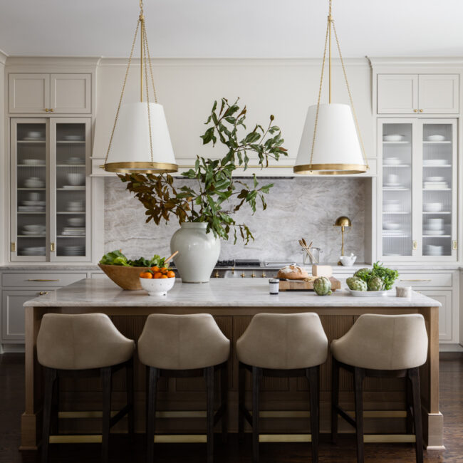 Finally, the design team rearranged the kitchen’s floor plan to accommodate a statement hood. A newly added large island provides storage and family seating, concealing the pantry behind faux cabinetry. The powder room also saw a dramatic makeover with custom marble countertops, emerald-colored paint and iconic leopard-print wallpaper, forming a dynamic and intriguing space adjacent to the kitchen. The subtle injection of blush pink in patterned draperies reflects the wife’s favorite color, adding another personal touch to the design.