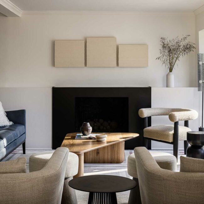 The first transformation involved skimming and flattening walls, replacing tile with hardwood flooring and updating lighting fixtures to brass and satin gold. The entire space was freshly painted in a warm white hue and then adorned with delightful, vibrant pops of wallpaper and art. The entryway also features a custom-sized chandelier juxtaposed alongside the original railing.