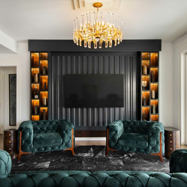 Interior Project: Single Space Cedar Creek Speakeasy Picturing an opulent space with speakeasy vibes, the design team sought to transform the clients’ lower level into a moody, 1920s-inspired retreat with