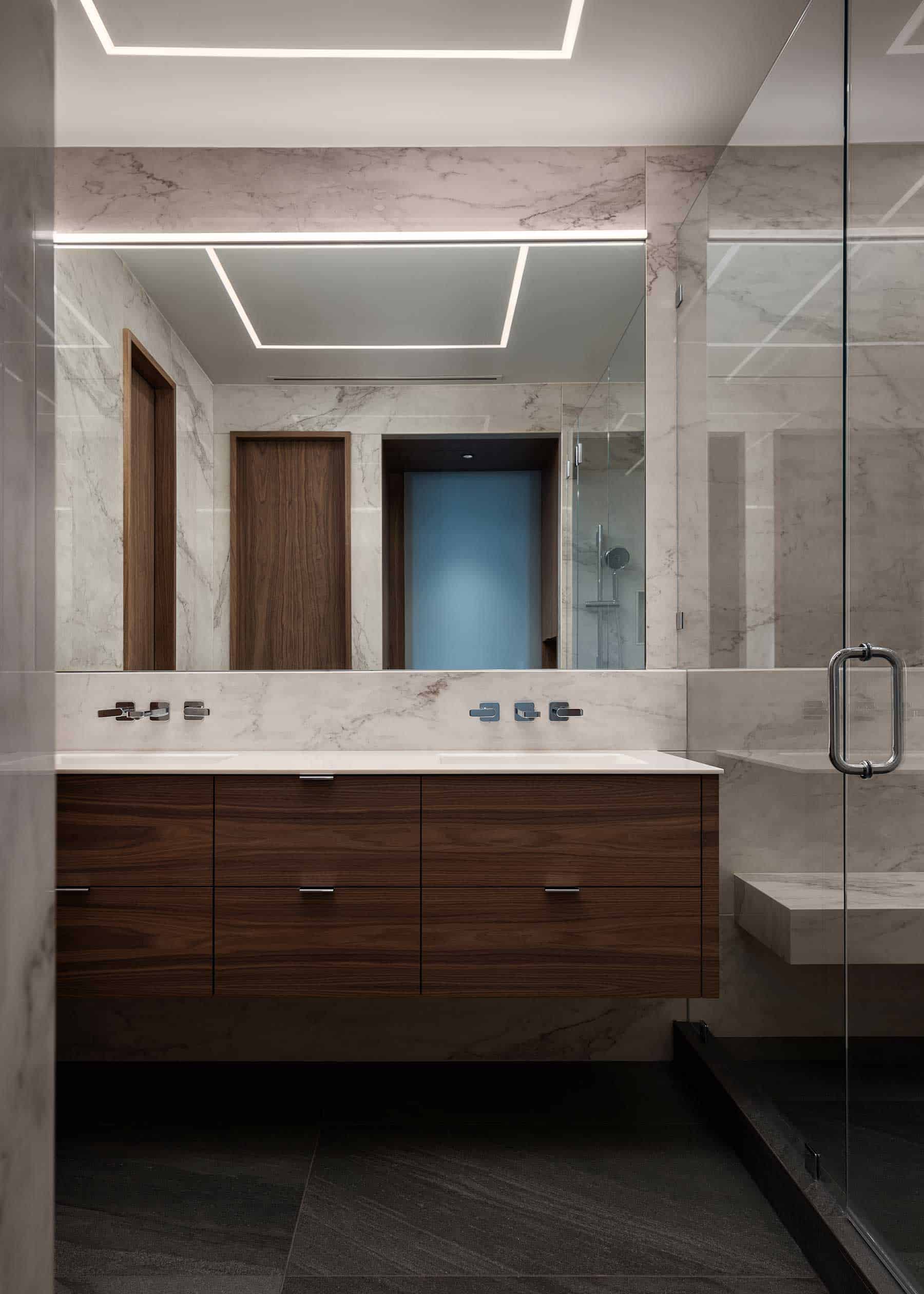 Every door was also removed and replaced. The door from the primary bedroom was substituted with a frosted glass pocket door, allowing for privacy, intrigue and illumination. The closet and toilet room doors were replaced with walnut-veneered doors and solid walnut frames. Since lighting is a key component of any bathroom, they integrated low-profile LED lighting into the ceiling and above the vanity mirror. The variation of lighting illuminates the space while also dramatically changing the appearance. Finally, the project team used large-format tiles to help maximize the scale of the space and provide a clean, monolithic appearance.
