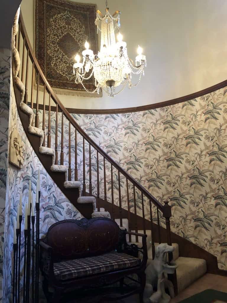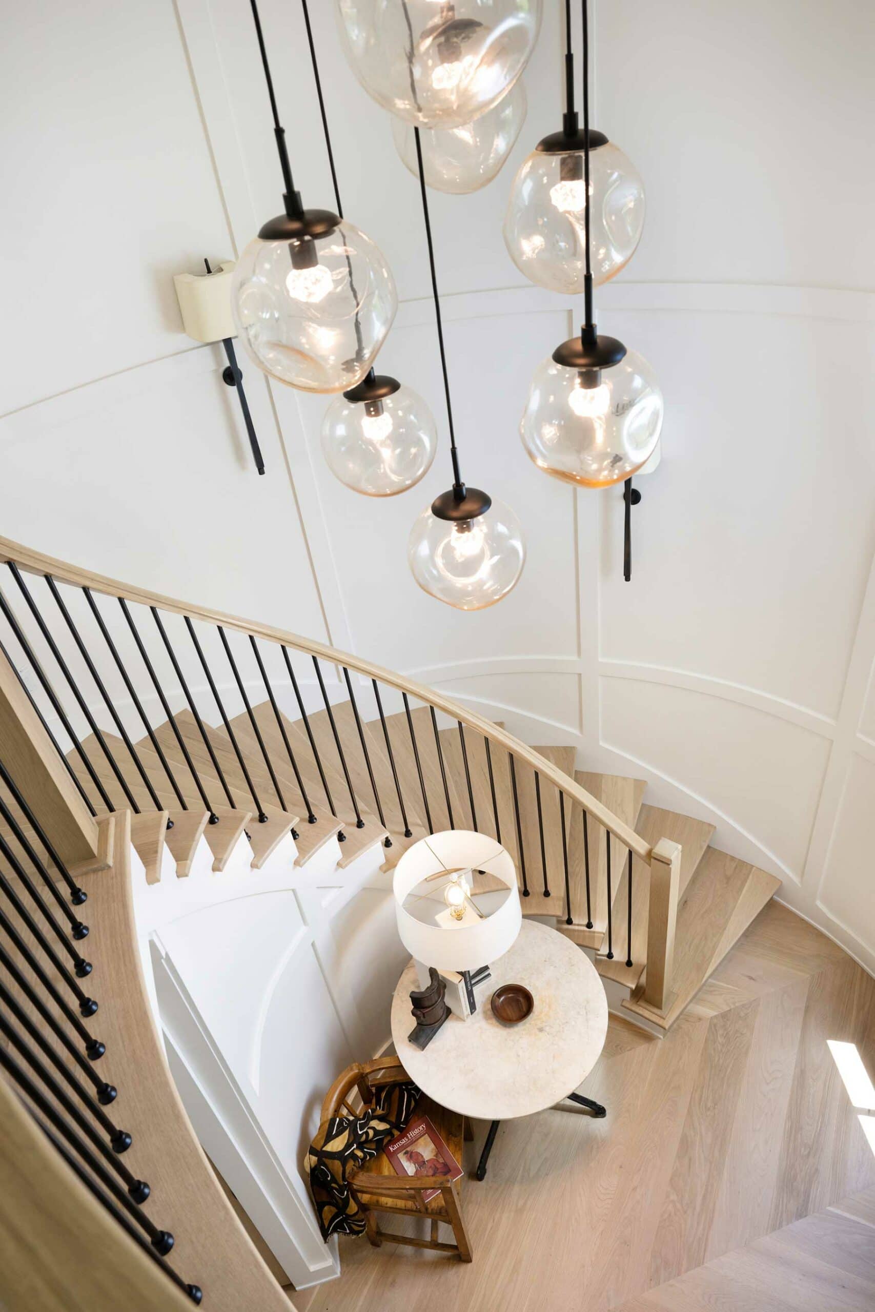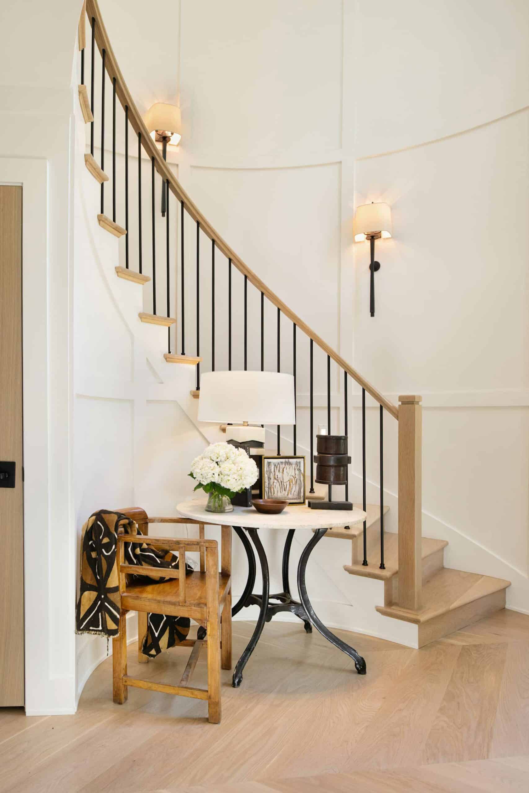 A bright-white paneled wall reinvigorates the curved staircase at the entry. The team also changed the front door, enlarged the turret window, designed a custom awning and added coach lights to the exterior. Painted brick in a German schmear finish and a new front-side porch bring the elevation to life.