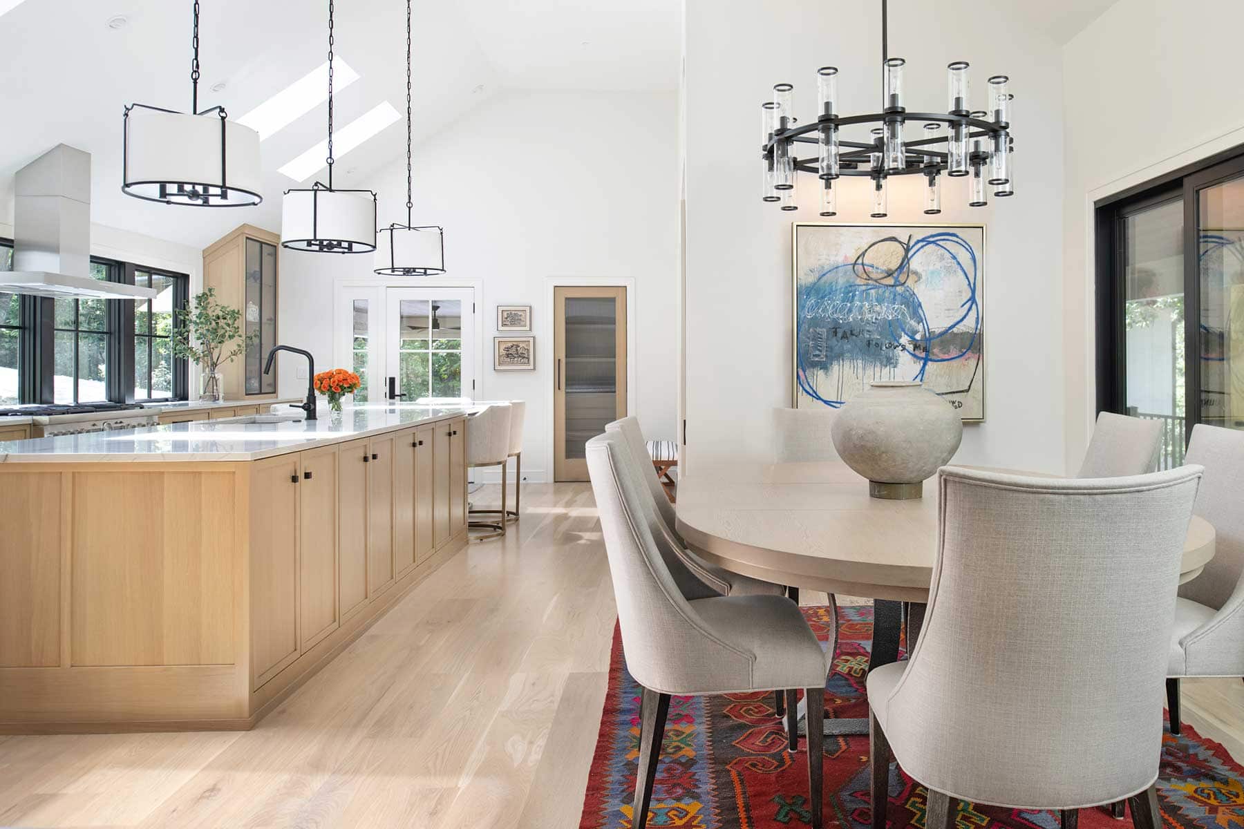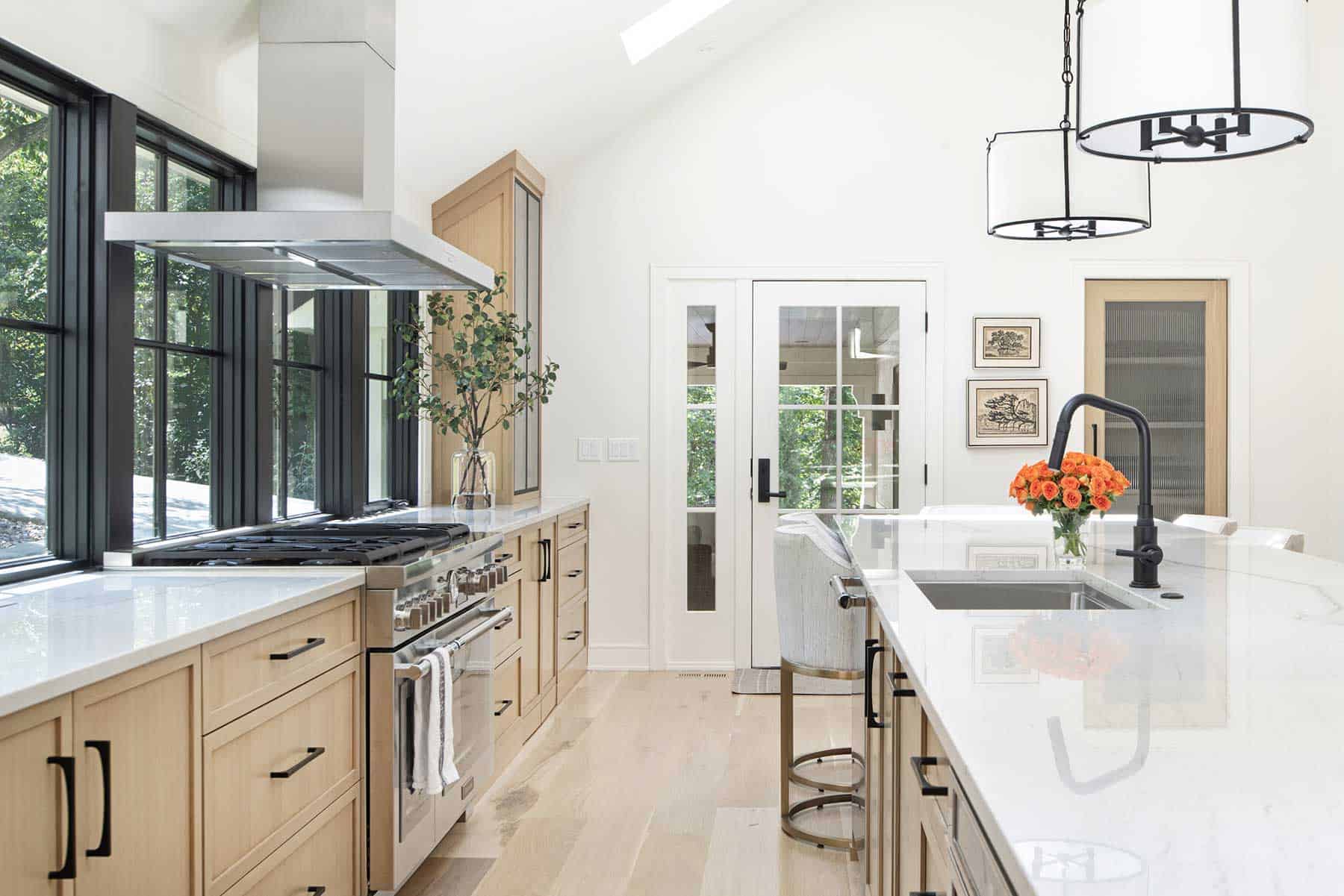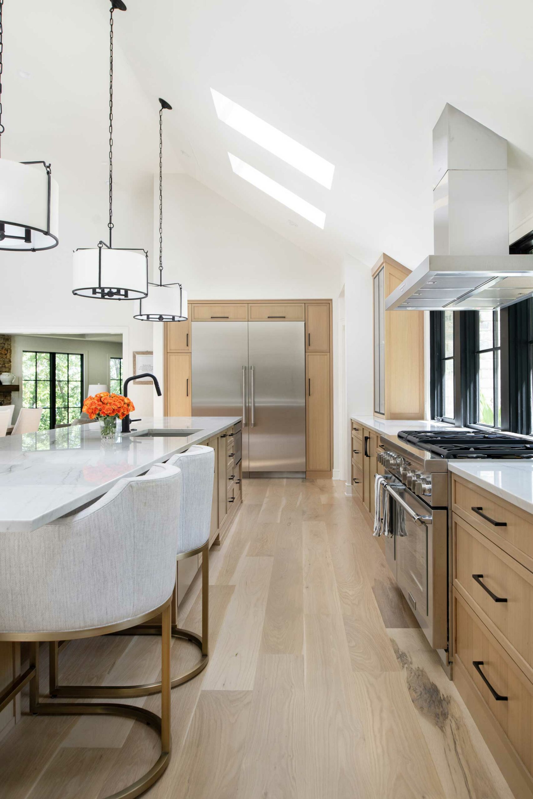 This Lake Quivira property is the owner’s childhood home. The goal was to lighten and brighten everything, eliminating the heavy-handed Tudor style. One of the project’s major challenges was the kitchen and dining area. The client desired a chef’s kitchen with an extensive island and plenty of storage, which required moving walls, making the ceiling height appropriate for the space and adding windows and doors. A row of front-facing kitchen windows provided much-needed light and a modern aesthetic. The new linear design made room for the large, butterfly-matched quartz island in the middle of the kitchen. Optimally configured, the island’s open-ended left side houses five stools and leaves ample room for storage on the opposite side.