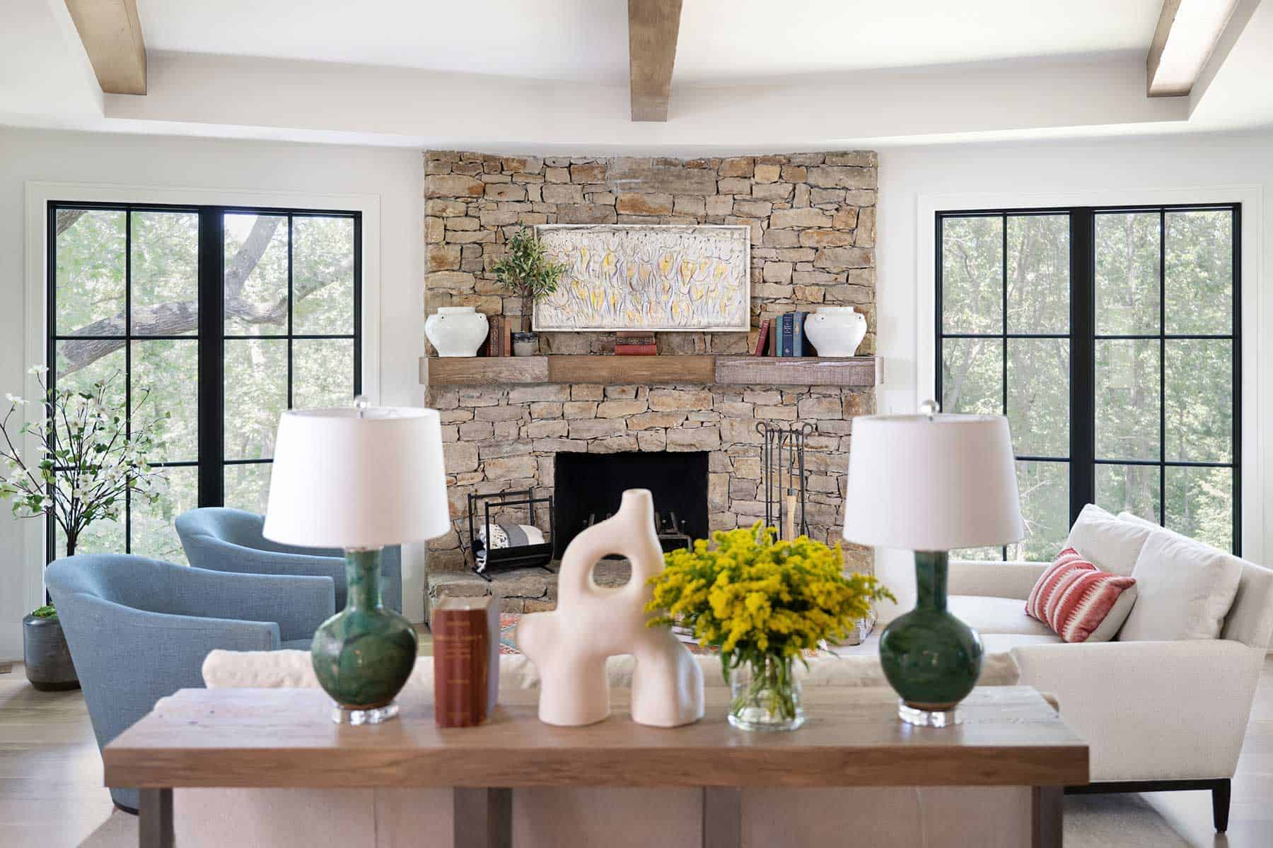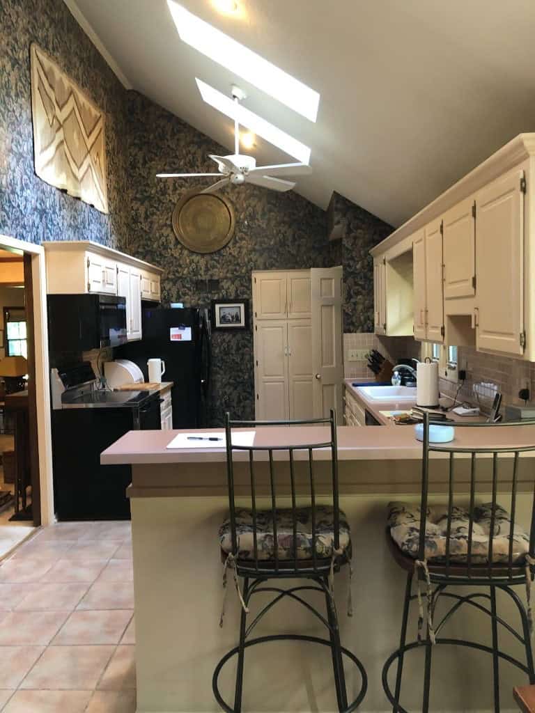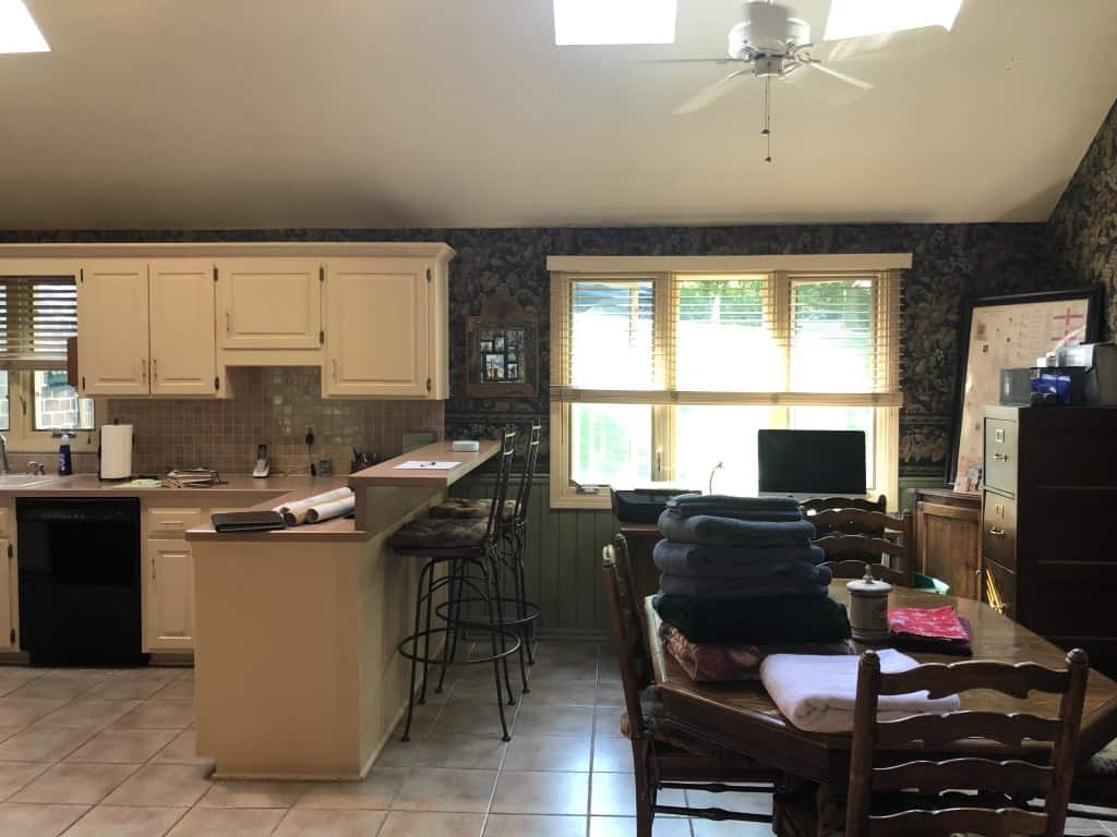 This Lake Quivira property is the owner’s childhood home. The goal was to lighten and brighten everything, eliminating the heavy-handed Tudor style. One of the project’s major challenges was the kitchen and dining area. The client desired a chef’s kitchen with an extensive island and plenty of storage, which required moving walls, making the ceiling height appropriate for the space and adding windows and doors. A row of front-facing kitchen windows provided much-needed light and a modern aesthetic. The new linear design made room for the large, butterfly-matched quartz island in the middle of the kitchen. Optimally configured, the island’s open-ended left side houses five stools and leaves ample room for storage on the opposite side.