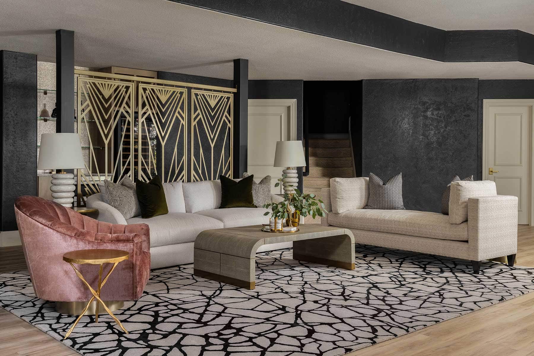 The lower level had an unusual layout containing a number of awkward, stepped-back niches and support posts in odd places, which presented a space-planning challenge. Prior to the remodel, the space was divided into a living area, a game area, a play area and a poorly functioning bar area. The room as a whole was ill-defined and had a dated Tuscan-style feel.