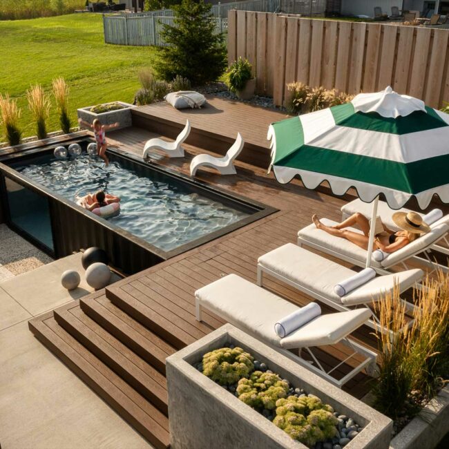 Outdoor space Container Poolooza A fresh take on a popular trend, this ambitious renovation project included multiple stages: exterior grading, pool and privacy fence additions,