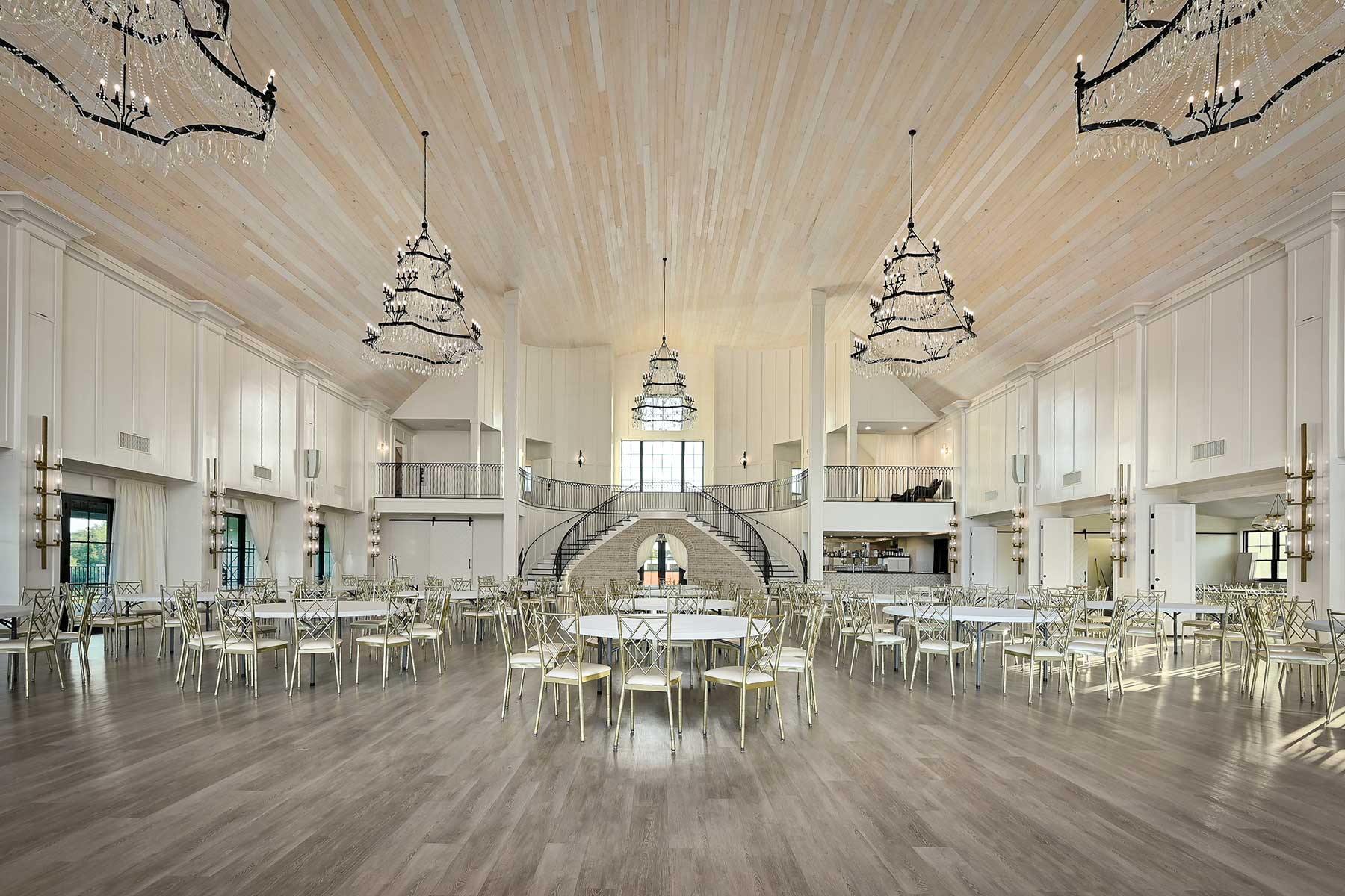 The monochromatic design of the interior and exterior allows for endless event styles and types. Each room within the venue possesses its own unique features. The ballroom showcases custom and locally made chandeliers, large windows, gambrel tongue-and-groove ceilings and an elegant grand staircase. With its cozy fireplace, the aux hall is an ideal setting for rehearsal dinners or intimate gatherings. Meanwhile, the second-floor cocktail lounge doubles as a bridal or groom suite for preparations. The lower level of White Iron Ridge boasts six private guest suites and a lounge area, providing comfortable accommodations for overnight guests. The honeymoon tower, featuring a private balcony, offers breathtaking panoramic views of the property.