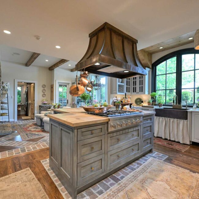 The kitchen’s new layout concept was a “wild” idea—a central range situated on the primary island with a custom floating hood facing the updated family room. A secondary island featuring a walnut top, powder-coated legs and a subjacent marble shelf serves as a prep surface. A taupe French range sits in the center of the main island, which showcases a creamy white marble countertop and a ceiling-mounted custom hood. The island comfortably seats eight and includes custom cutting boards that slide into each side of the island. The designers also created a new focal wall with a vast new window and a brass sink—both artfully placed between twin Sub-Zero fridge-and-freezer units opposite the range.