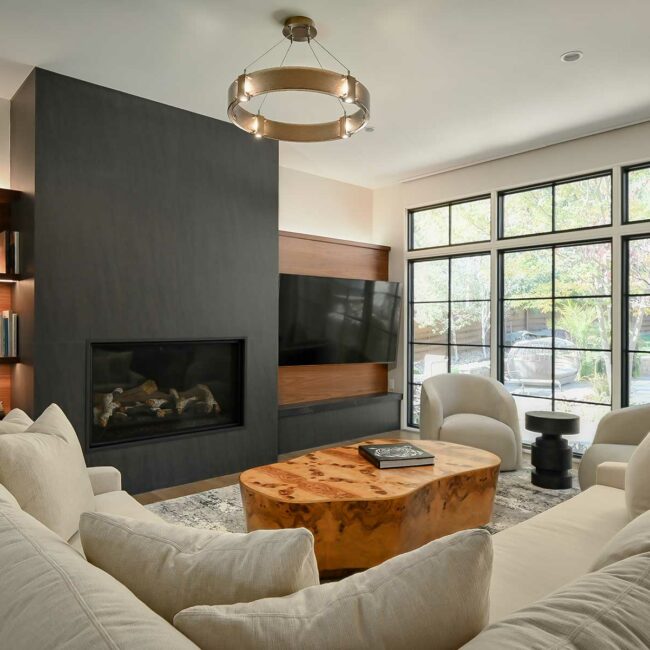 All the floors throughout were refinished to a soft, light oak color, imbuing the space with casual, welcoming energy. The adjacent family room has symmetrical doors to the living room and a new low-profile fireplace surround with handmade tiles. The entire space exudes a California Coastal vibe, furnished in warm, tactile fabrics, including two large custom ottomans made from antique Moroccan textiles underneath a burl wood console.