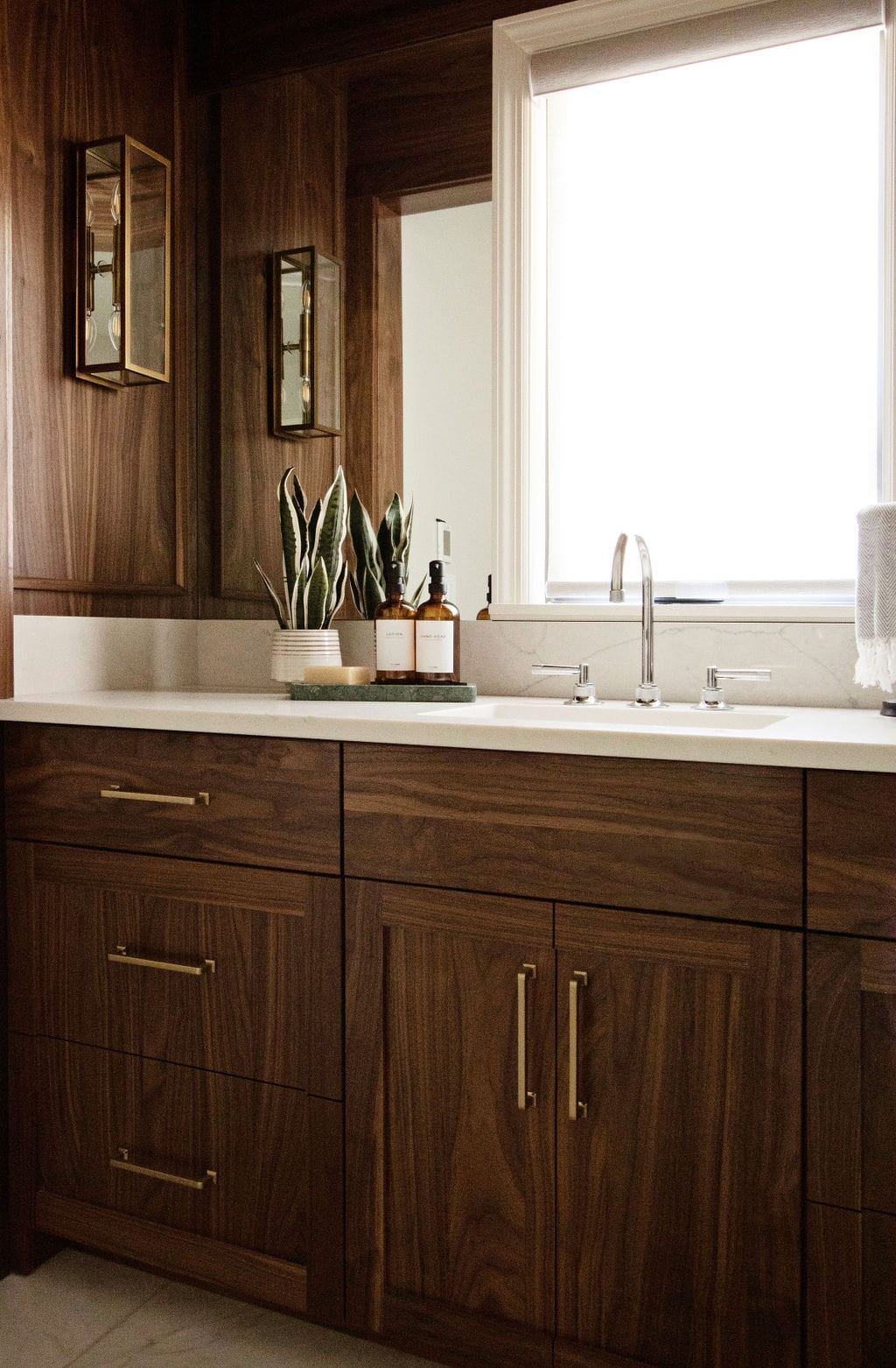 The project team transformed this formerly sprawling, outdated bathroom into a modern yet traditional retreat, balancing the distinct needs of both spouses while respecting the home’s architectural integrity. They successfully created separate yet cohesive spaces—one light and serene, the other warm and cozy—without sacrificing storage or style.