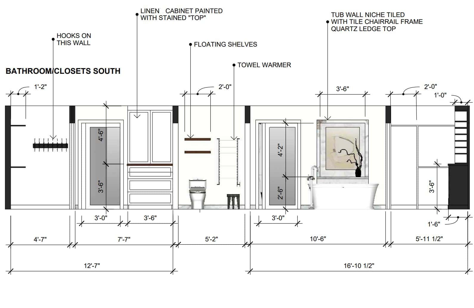 Smart storage solutions, including expanded closets and integrated lighting, elevate the layout, offering both luxury and comfort. The outcome? A harmonious, inviting bathroom that fosters marital bliss.