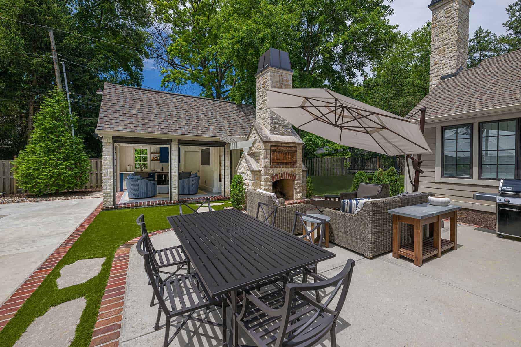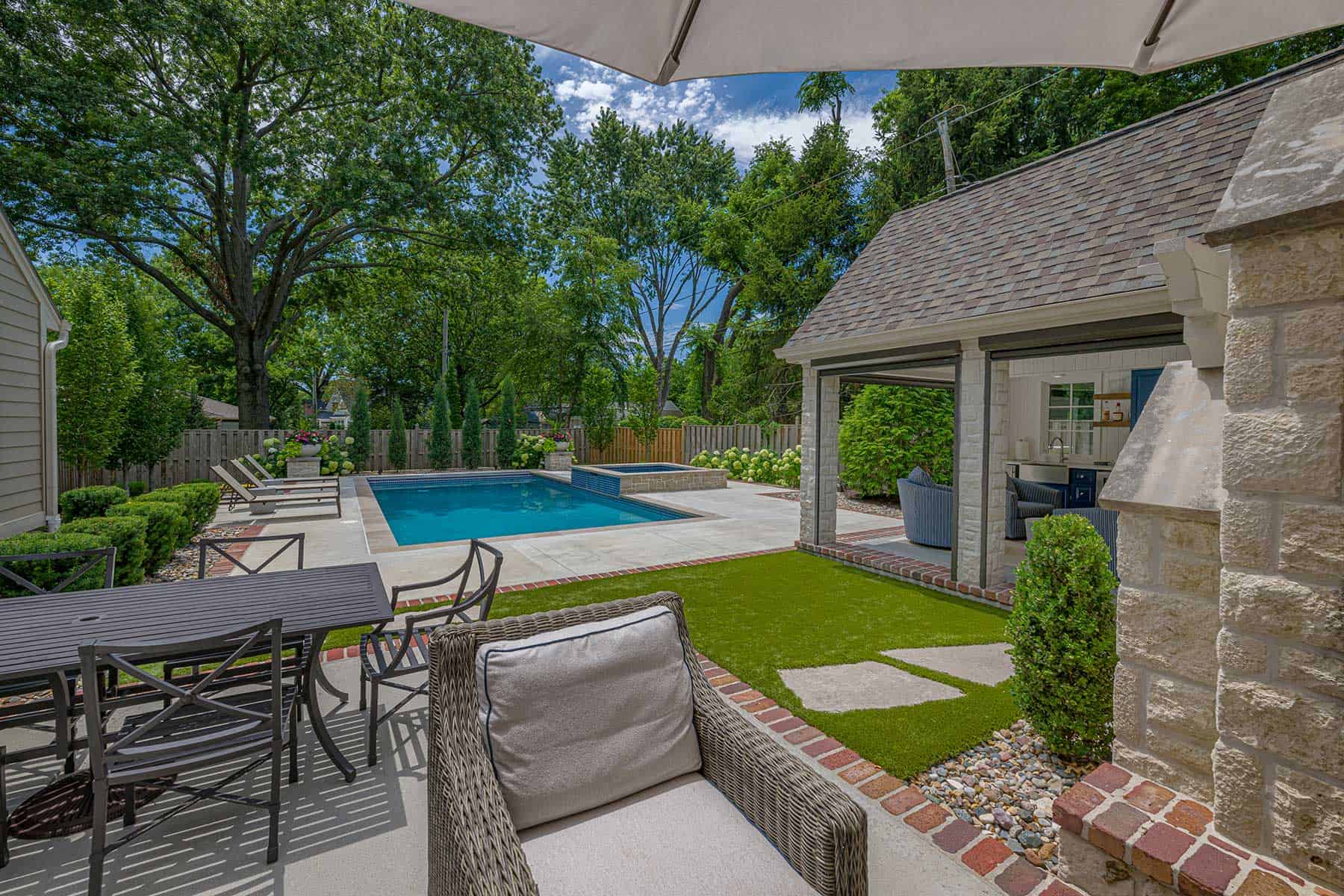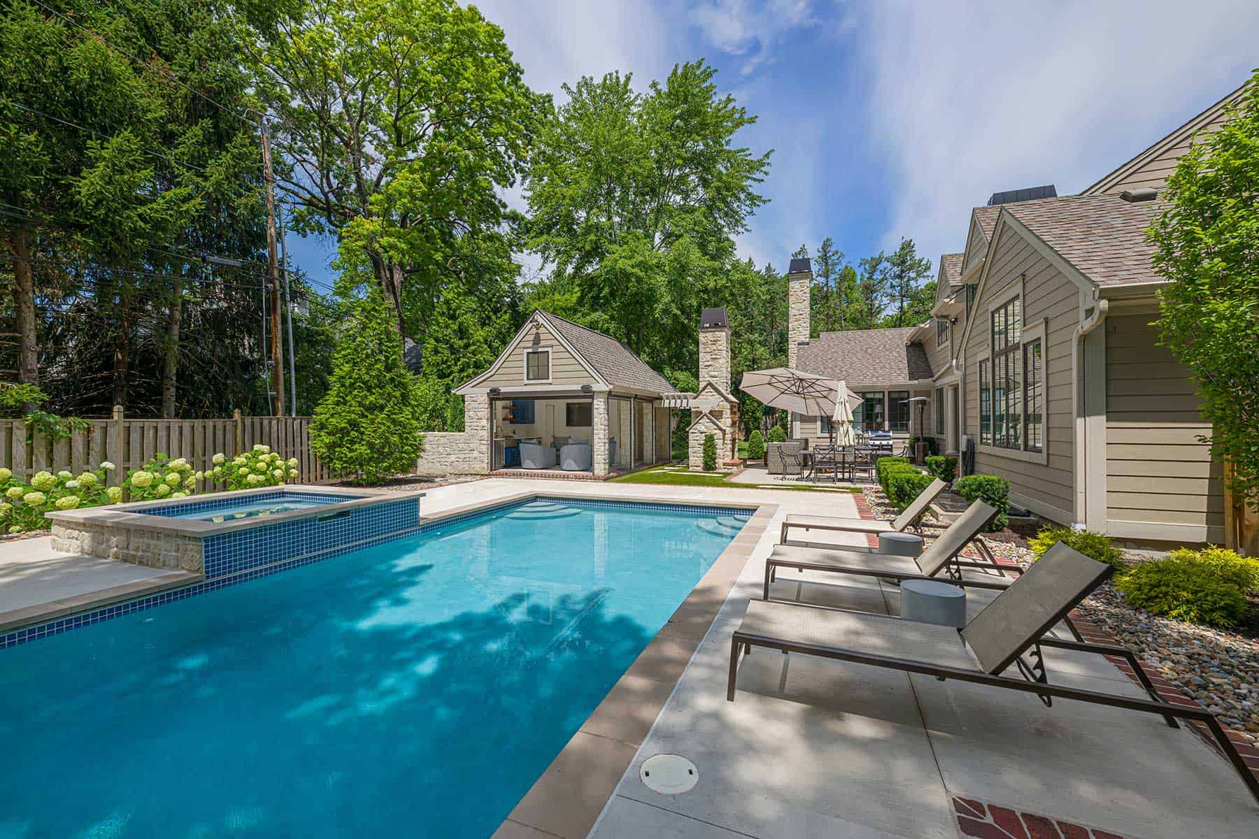 The challenge lay in integrating new features—including a pool, hot tub and cabana—into an already developed space without creating a fragmented aesthetic. By positioning the cabana strategically, the design enhances the sense of an enclosed outdoor room while preserving fluid connections between the patio, fireplace and pool terrace. The pièce de résistance? A timber trellis linking the cabana to the fireplace, elevating both elements into a grand architectural statement.