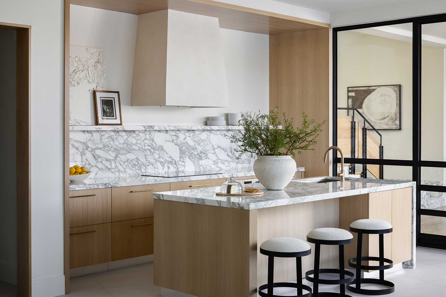 The kitchen, with its Arabescato Corchia marble, becomes the heart of the home, ideal for culinary enthusiasts and entertaining. The white oak floors, custom stained to complement the striking Tricorn Black accents, enhance the home’s luxurious feel. Every detail, from the sleek open floor plan to eco-conscious design choices, ensures the residence is as sustainable as it is beautiful. This home is a perfect balance of style and practicality, crafted for modern living at its finest.
