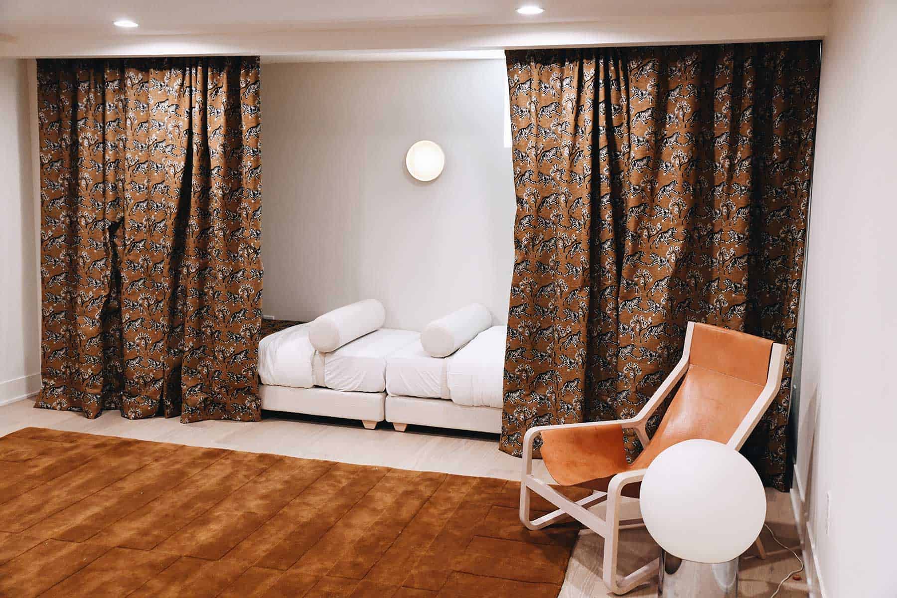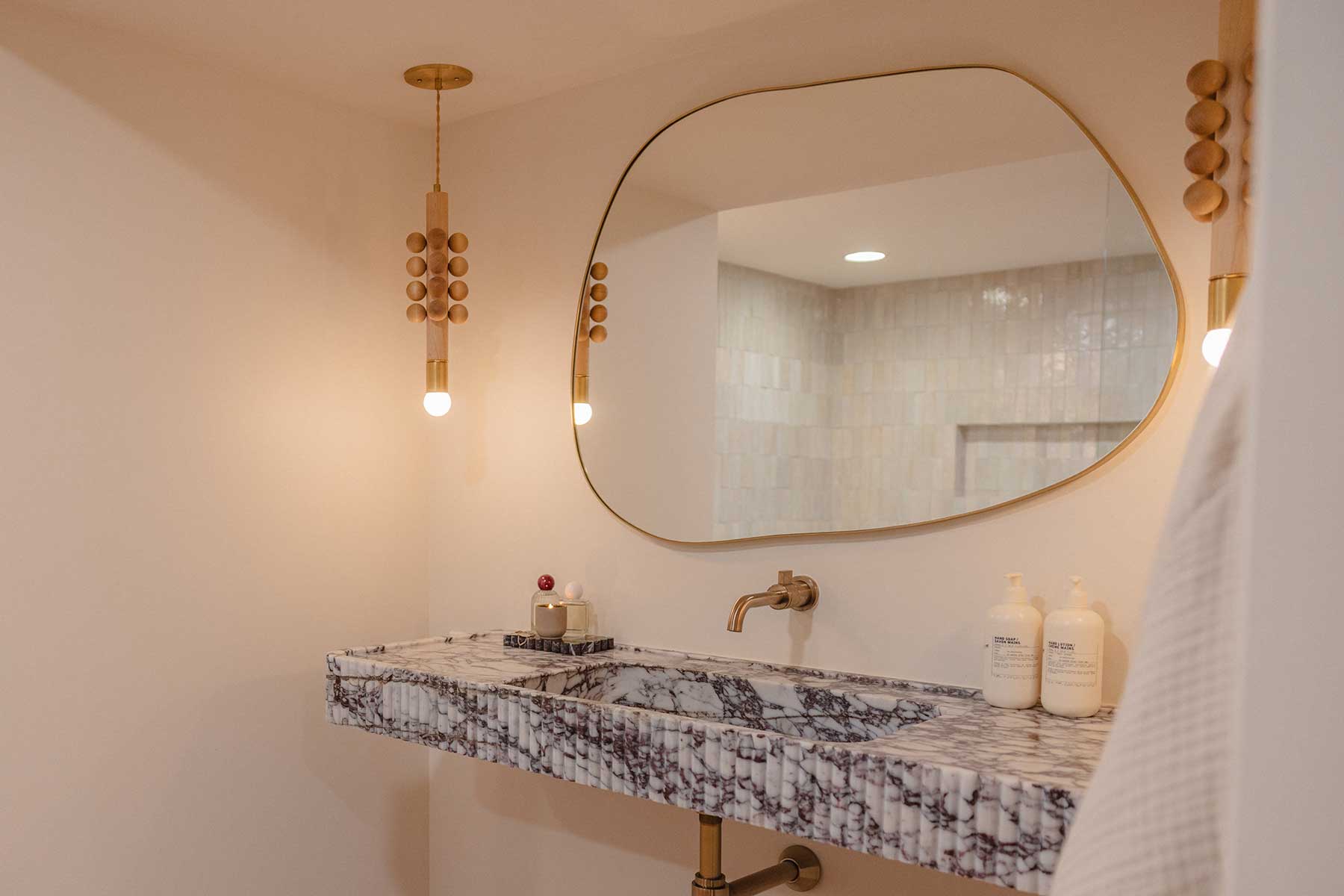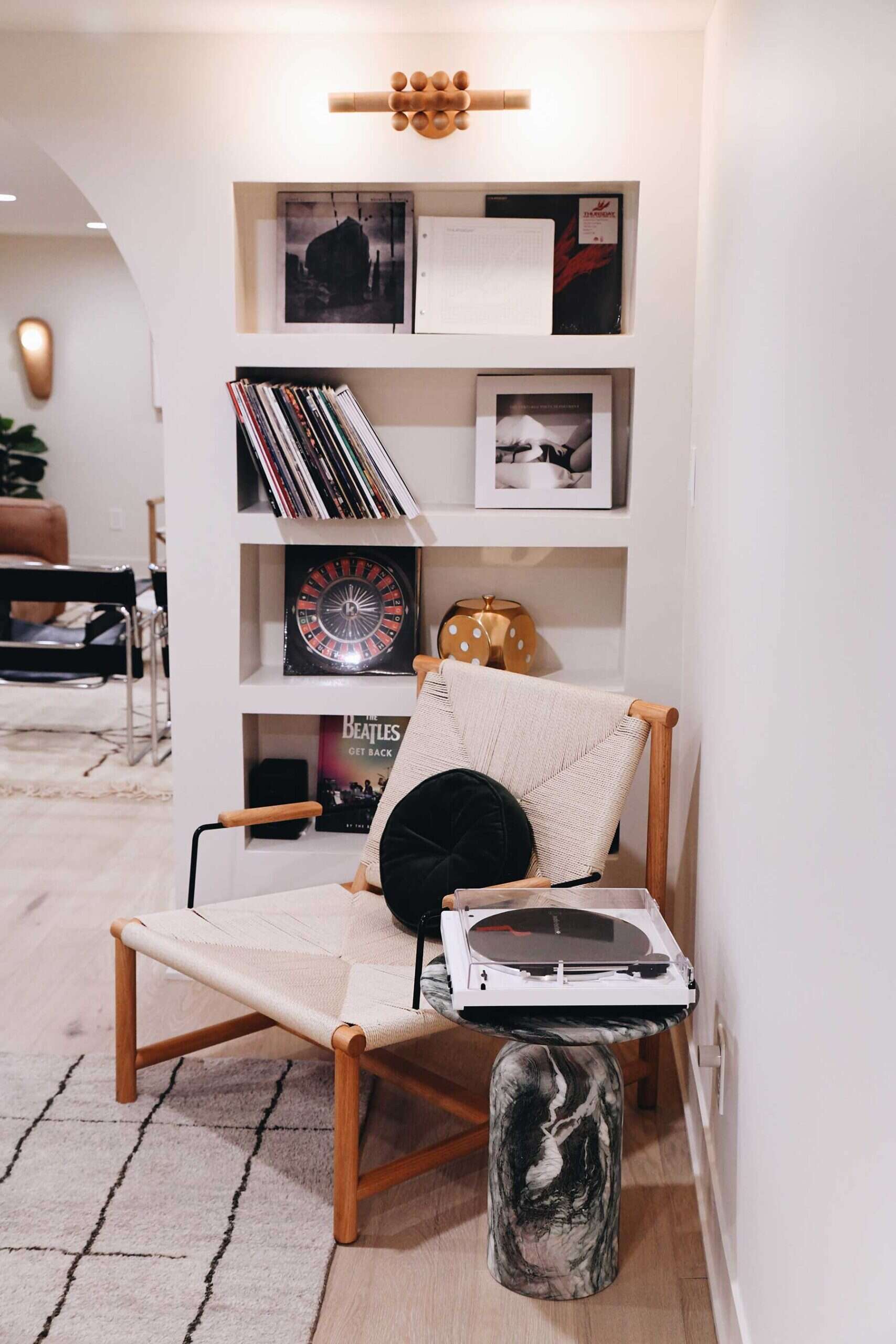 KCBR Design | Remodel reimagined a 2,000-square-foot basement, inspired by the clients’ love for Palm Springs. The space features two bedrooms, a luxurious bathroom, music room, gym and lounge, all designed with natural materials like wood, clay and stone. An elegant entrance welcomes guests with built-in shelves and custom displays, while recessed ceilings enhance height. Thoughtfully placed arched openings and custom shelving ensure this space beautifully balances style, comfort and practicality.