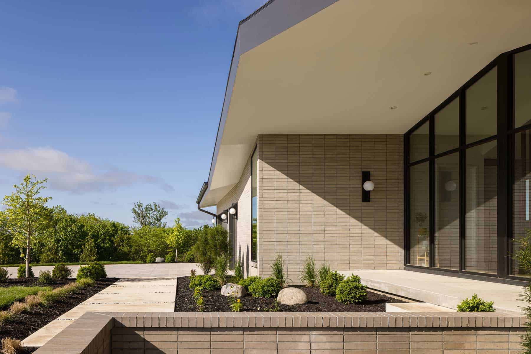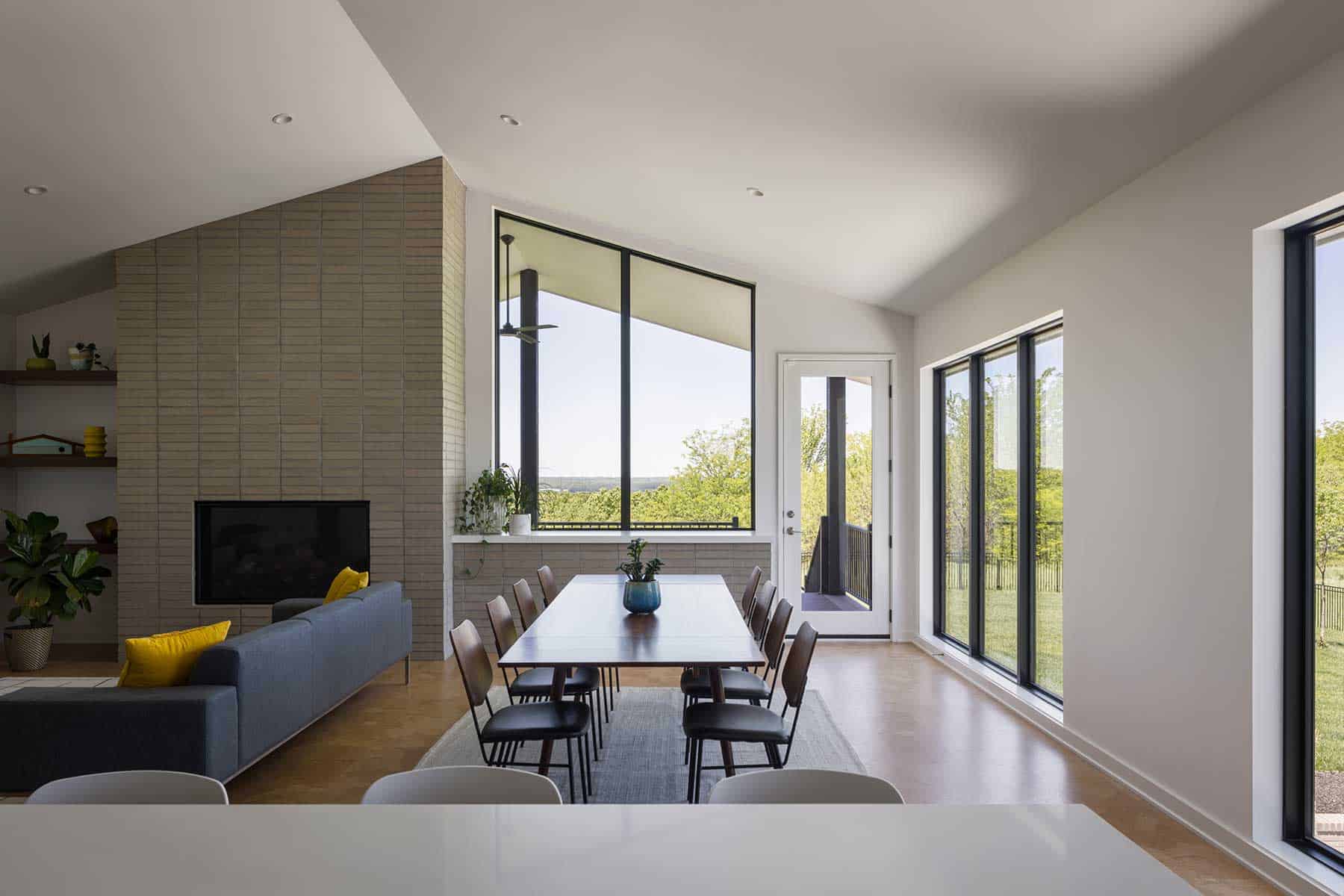 A transparent entry porch welcomes natural light and emphasizes a strong relationship with the outdoors. Inside, expansive gathering areas contrast with more intimate spaces, creating balance throughout. The homeowner’s input on interior selections brings a polished and inviting atmosphere, ensuring the home feels both curated and welcoming.
