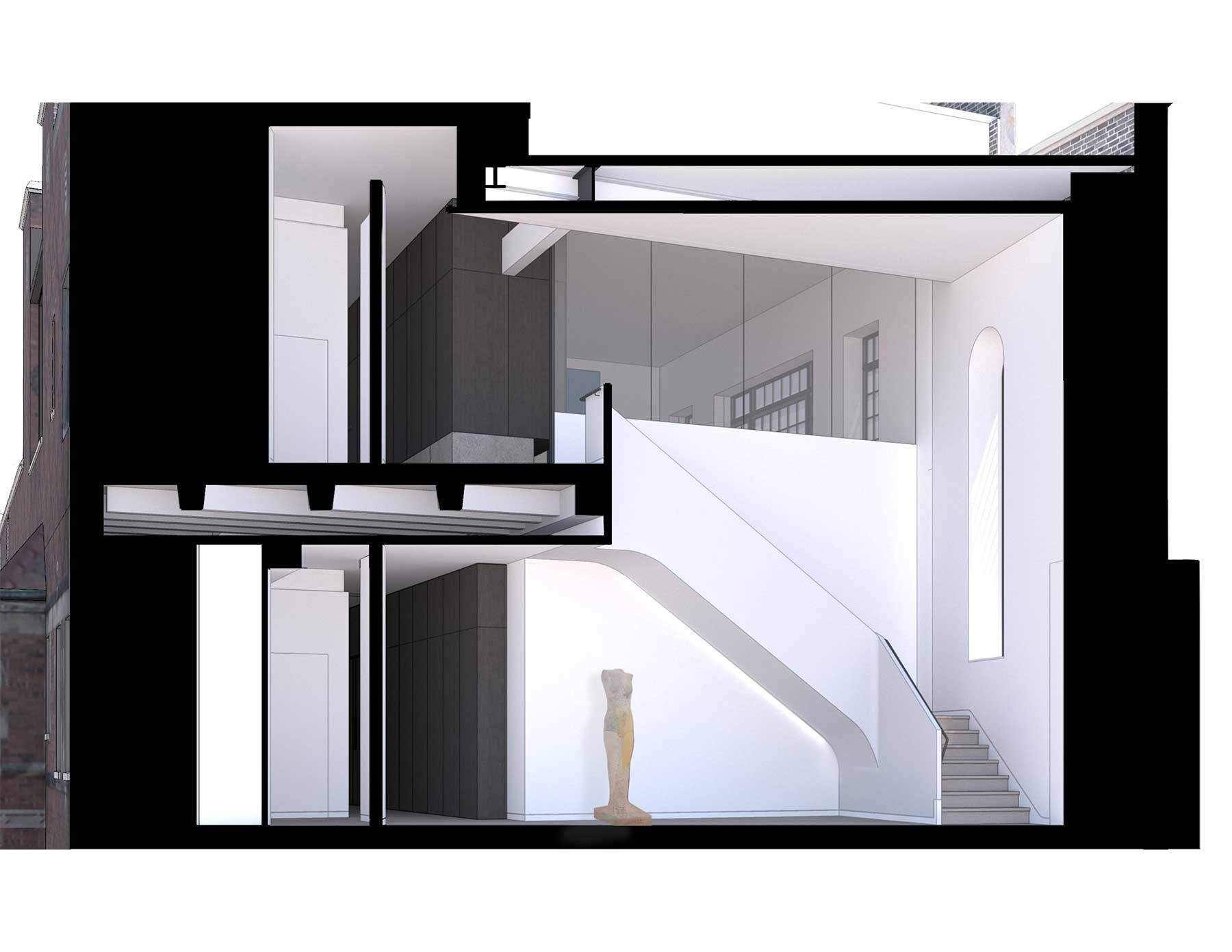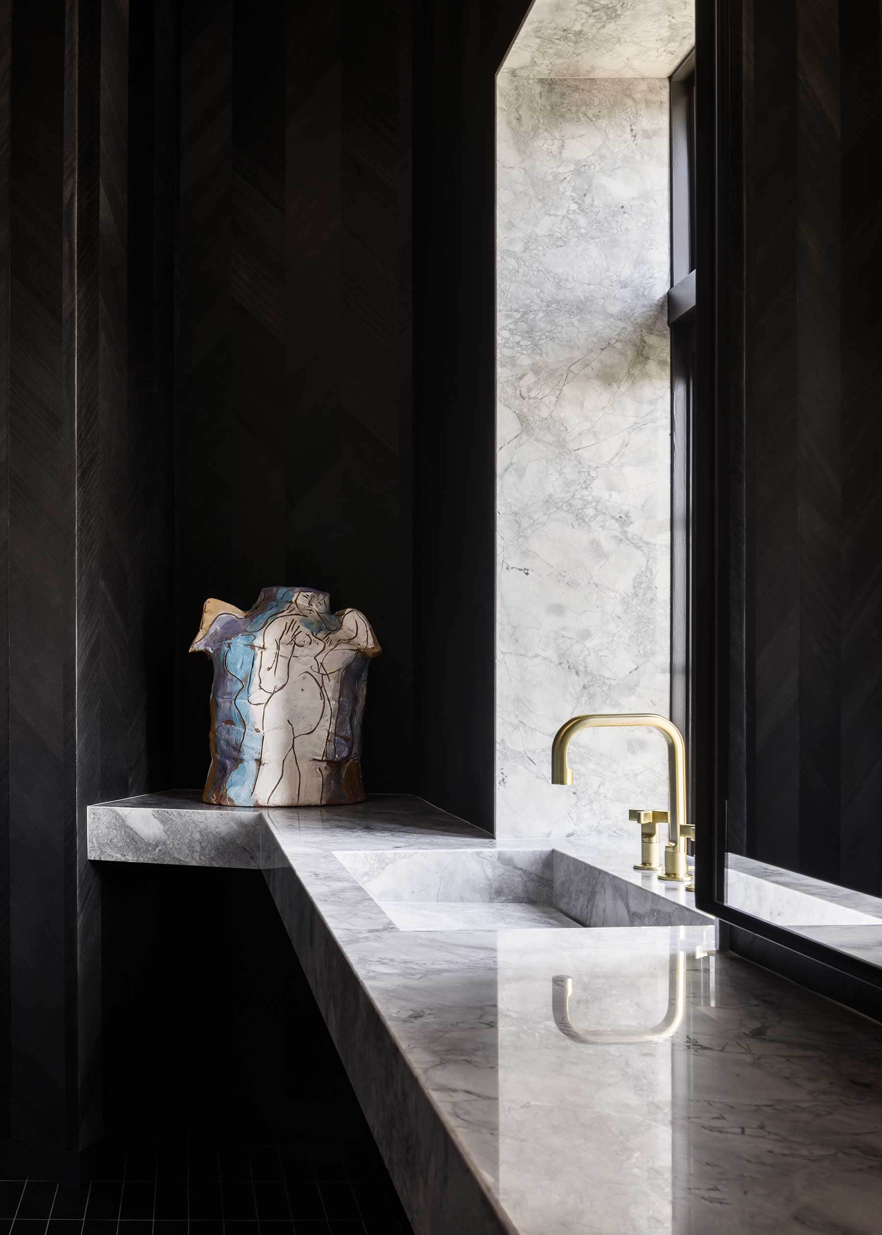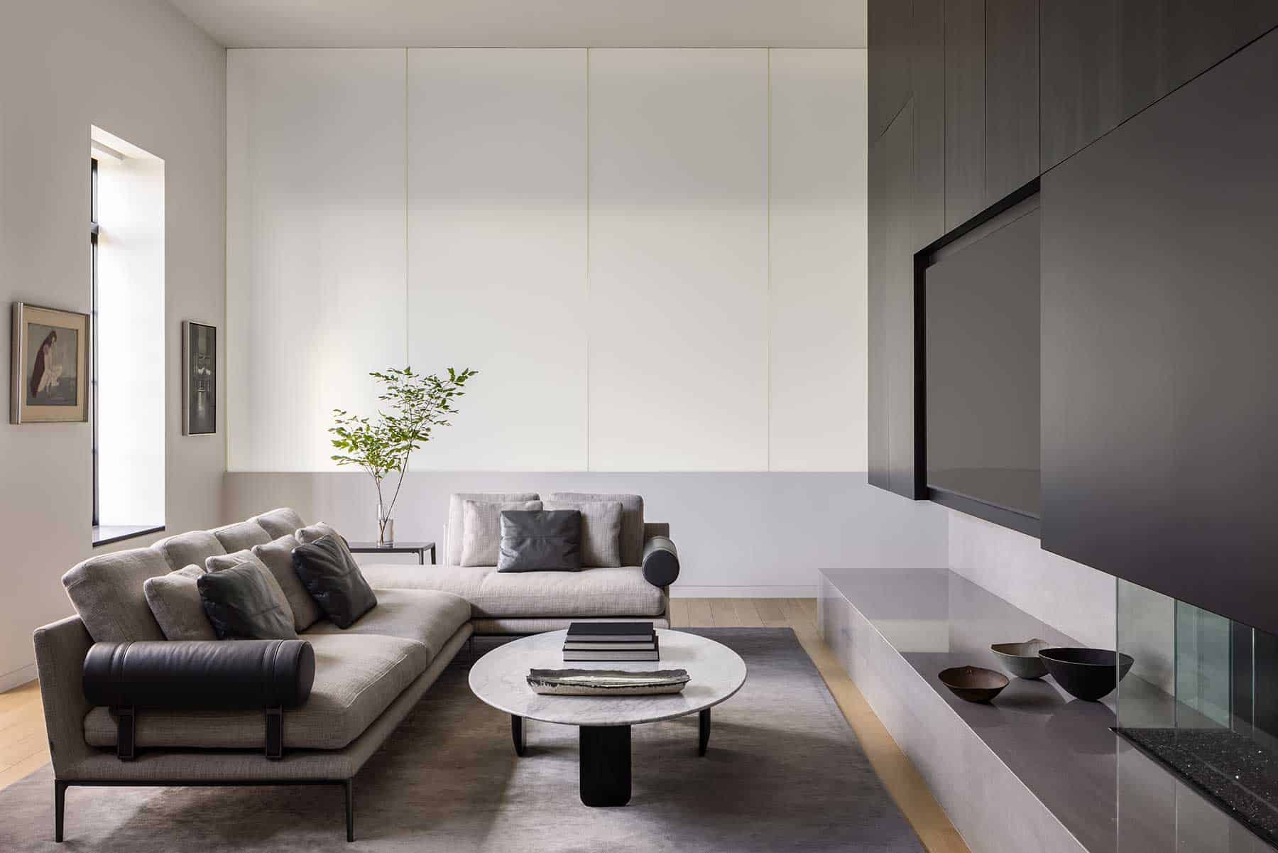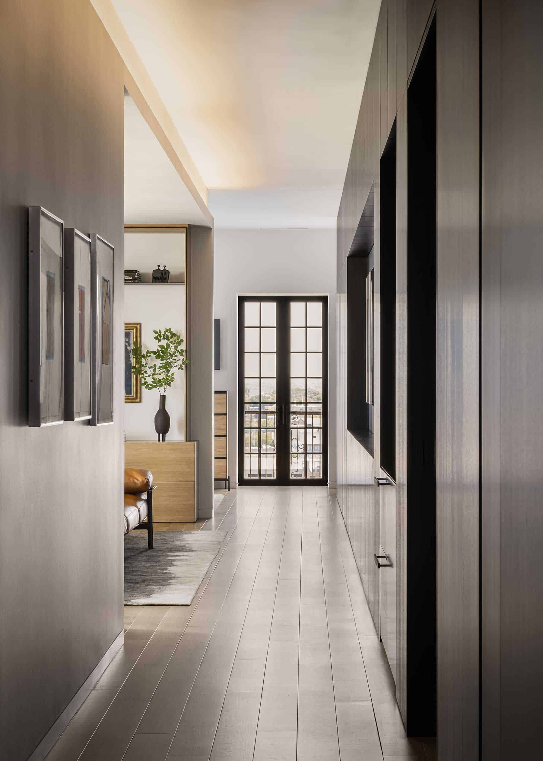 The design centers on an architectural spine wrapped in ebony-stained oak, seamlessly integrating storage, art displays and functional elements. A sculptural staircase ascends to the upper level, where natural light floods the public areas. Expansive glass doors lead to the rooftop terrace, effortlessly connecting indoor and outdoor living.
