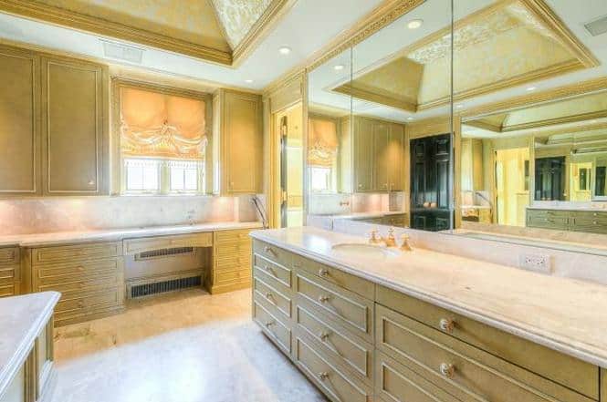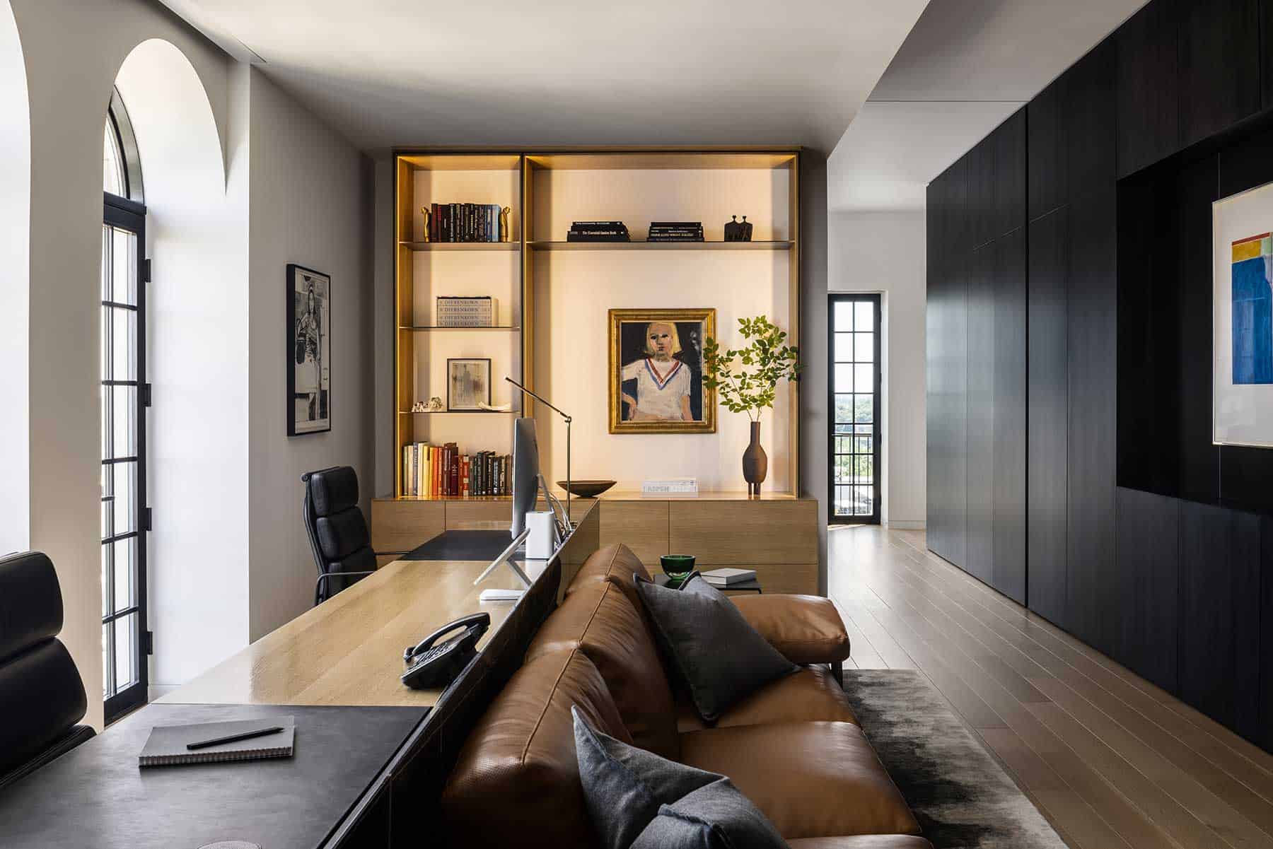 Custom furnishings, such as a marble desk and mohair upholstered bed, add texture and warmth to the home. Every detail was carefully curated to reflect a sophisticated mix of historic and modern elements.