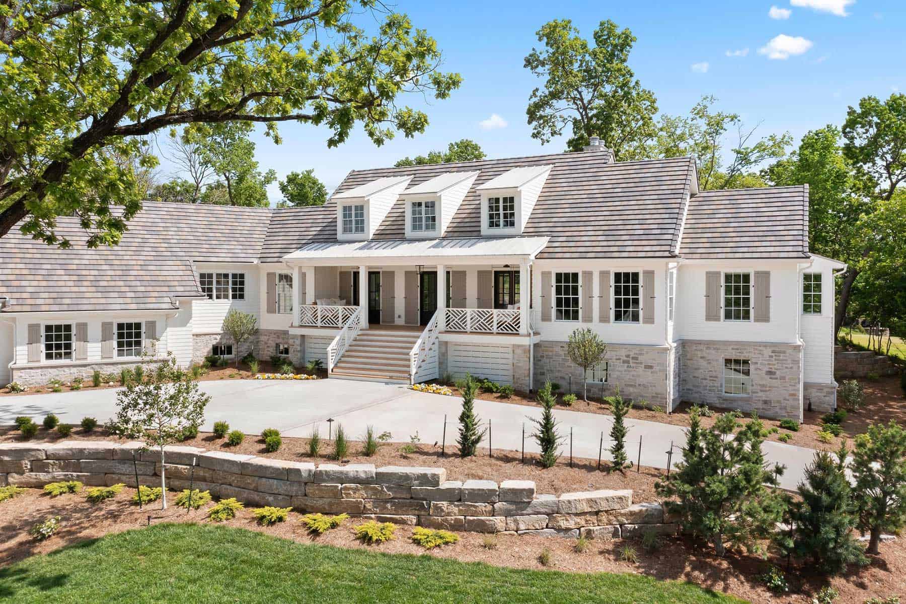 Large covered porches front and back invite relaxed outdoor living, while a chef’s kitchen flows into the great room, perfect for gatherings. The home features four bedrooms, four and a half bathrooms, and unique spaces such as a ballet room and craft room, with hidden storage to maintain a clean aesthetic.