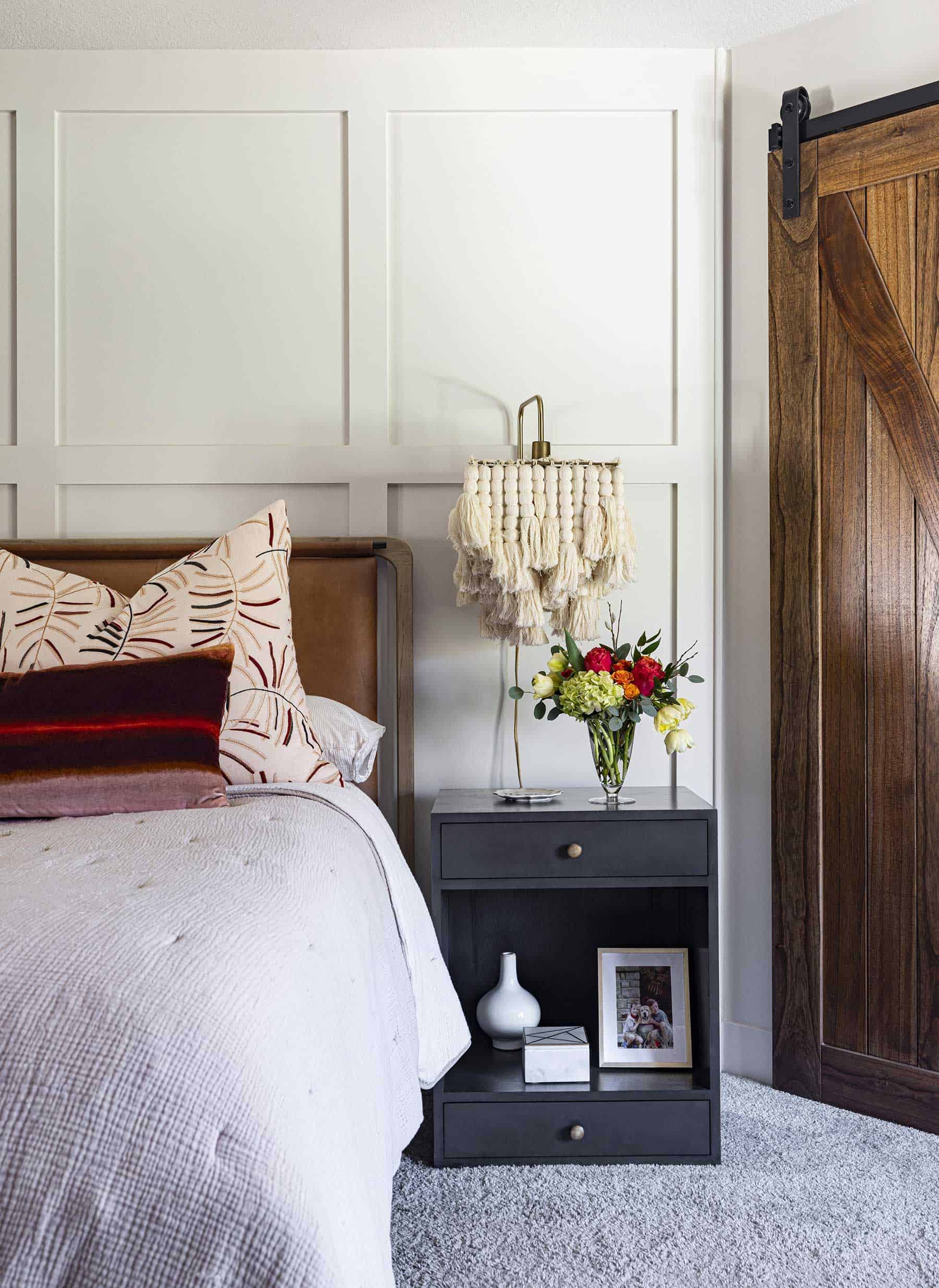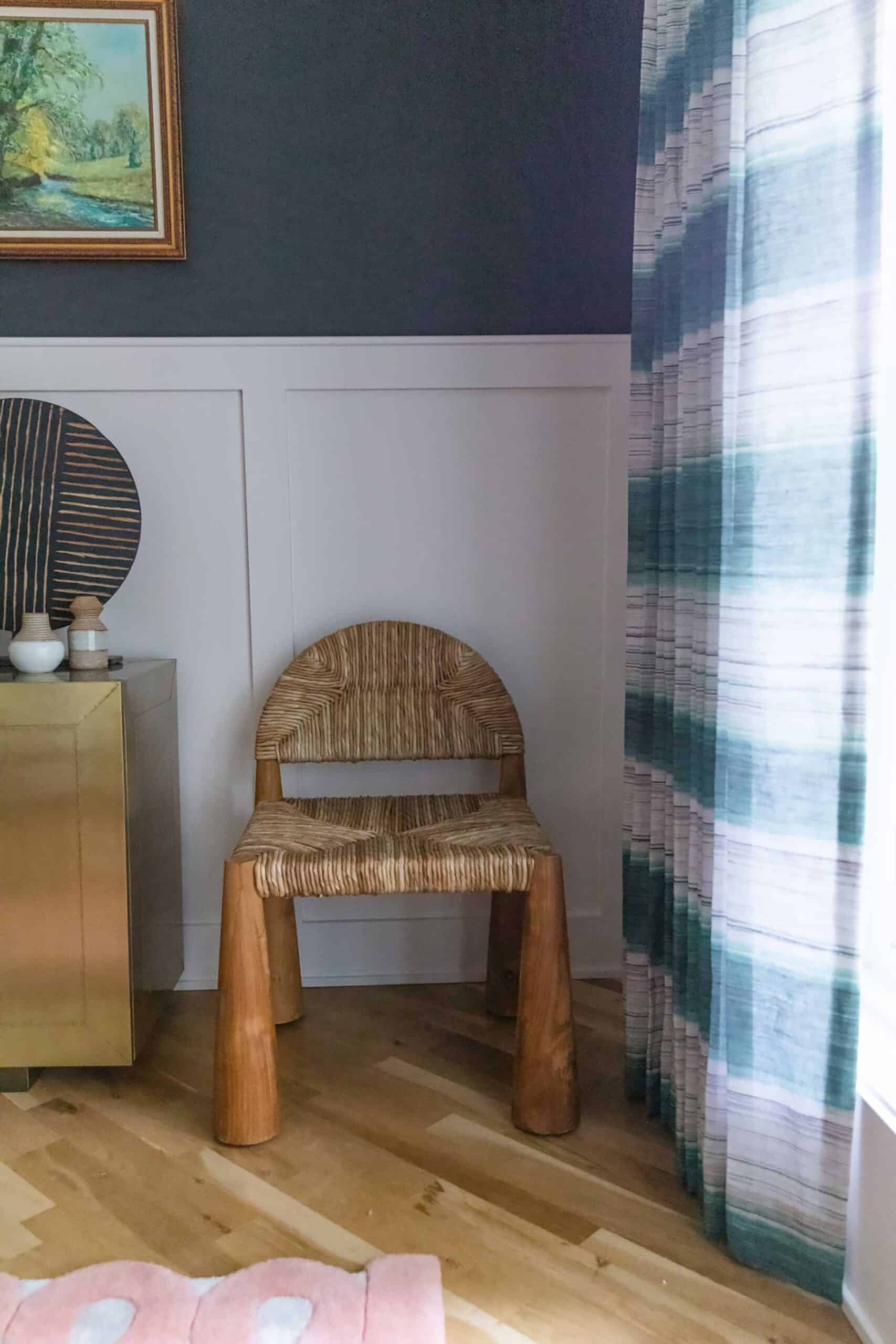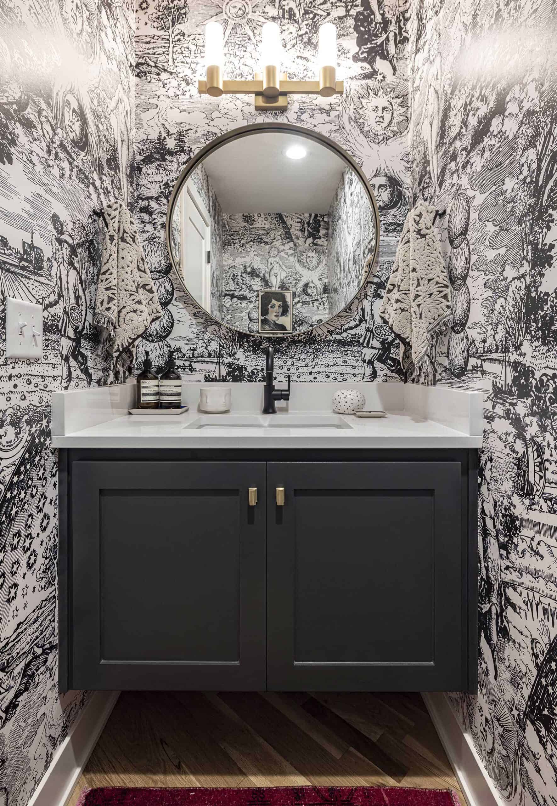 Custom built-ins in the living room now showcase a treasured record collection and travel finds, while striking hues draw attention to the fireplace artwork. The dining room’s deep black walls and rich textures add drama, and the primary suite embraces bold wallpaper and warm tones for an enveloping feel. Layered textiles, curated art and collected pieces turn this house into a deeply personal home.